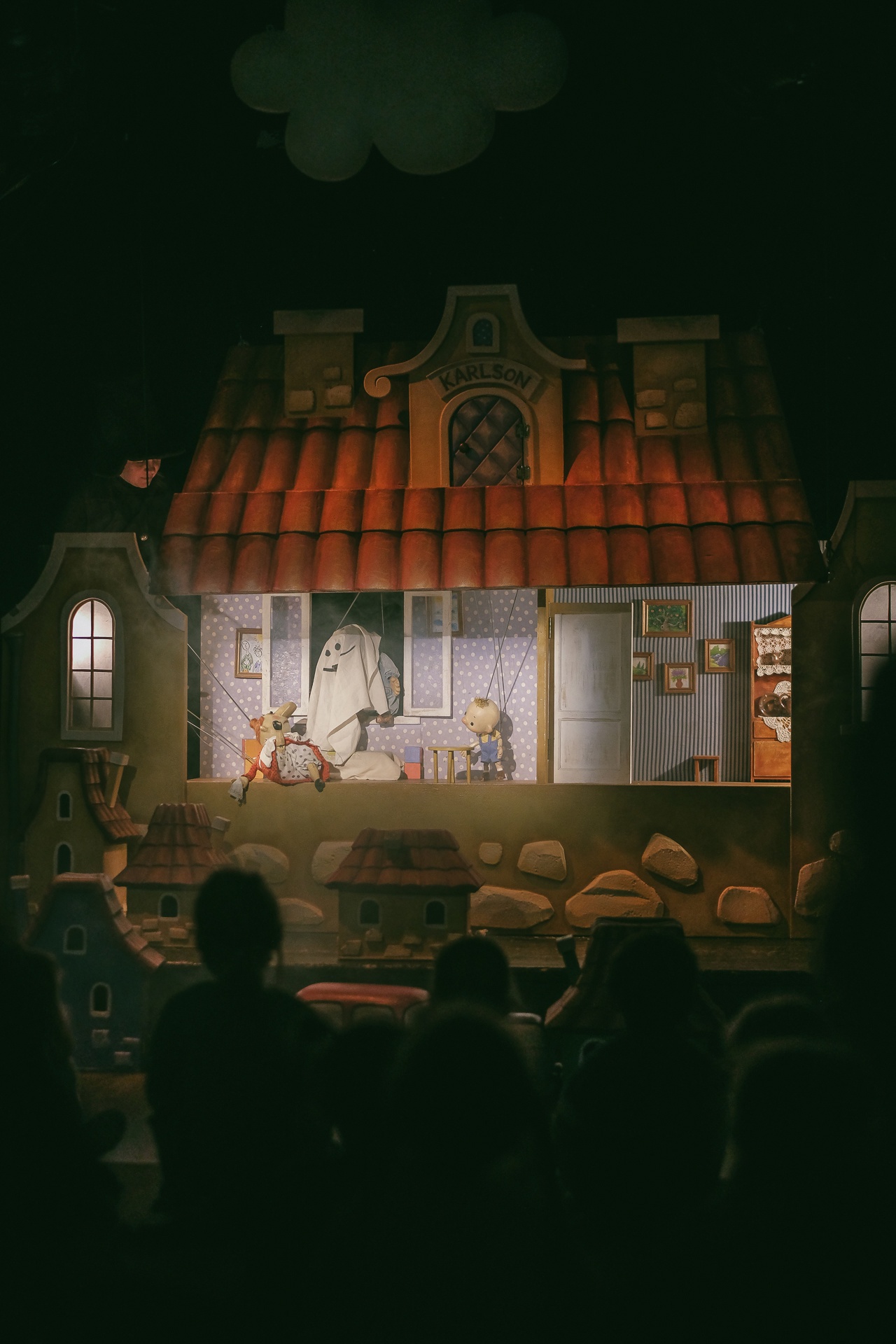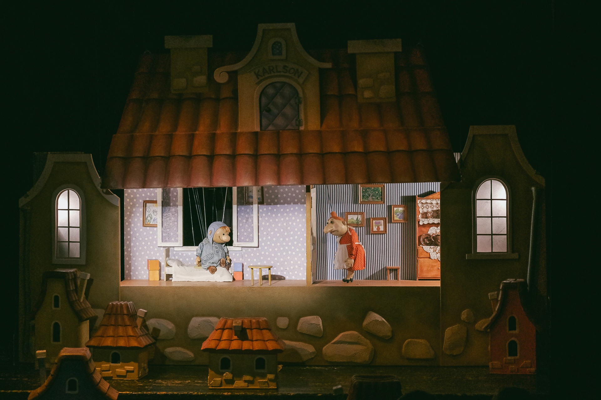 В определенные моменты артисты-кукловоды прячутся за домом, основной декорацией спектакля, и на сцене появляется комната, в которой Малыш, Карлсон и Фрекен Бок начинают свое представление. Невероятно талантливые и энергичные артисты Филипп Бородин, Юлия Курочкина, Алиса Дроздова Алиса Ковальская в течение часа удерживали внимание очень непоседливых детей.