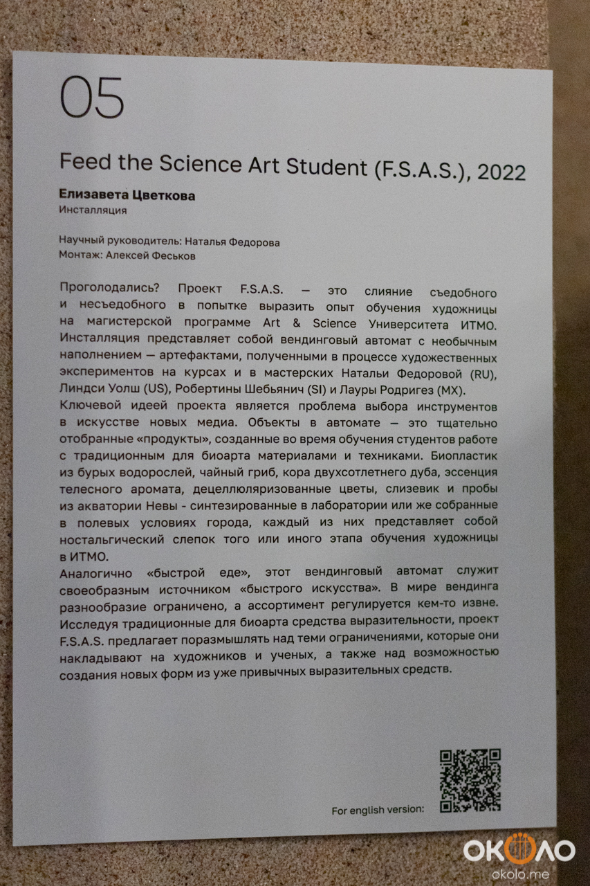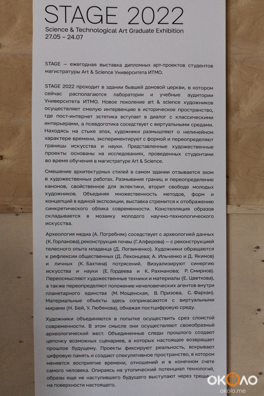 Проект STAGE (Science & Technological Art Graduate Exhibition) задуман как сцена для новых имен в российском научно-технологическом искусстве. В экспозицию вошли дипломные проекты третьего выпуска магистерской программы Art & Science Университета ИТМО. Художественные исследования на стыке искусства, науки и технологий представлены в формате интерактивных инсталляций, аудиовизуальных сред, VR, биоарт- и нейроарт-проектов.
