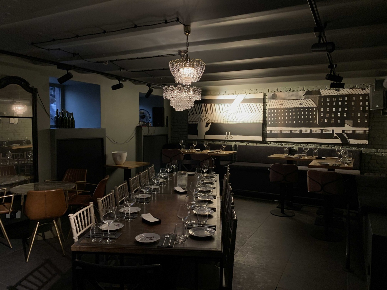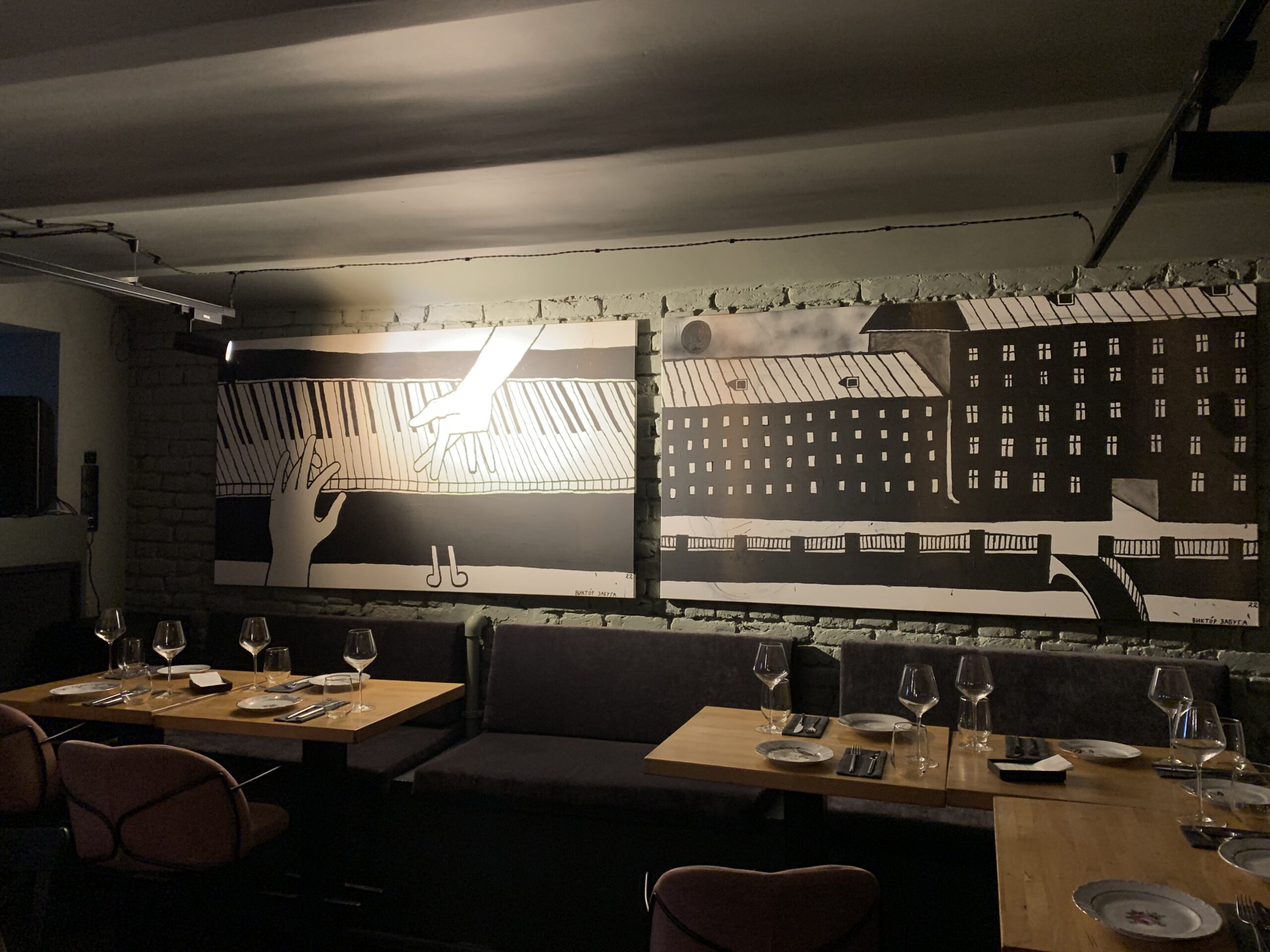ОКОЛО: Во всех четырех залах “Шума” — гостиной, «винном шкафу», кухне и баре — размещены произведения современного искусства. Расскажите о художниках.