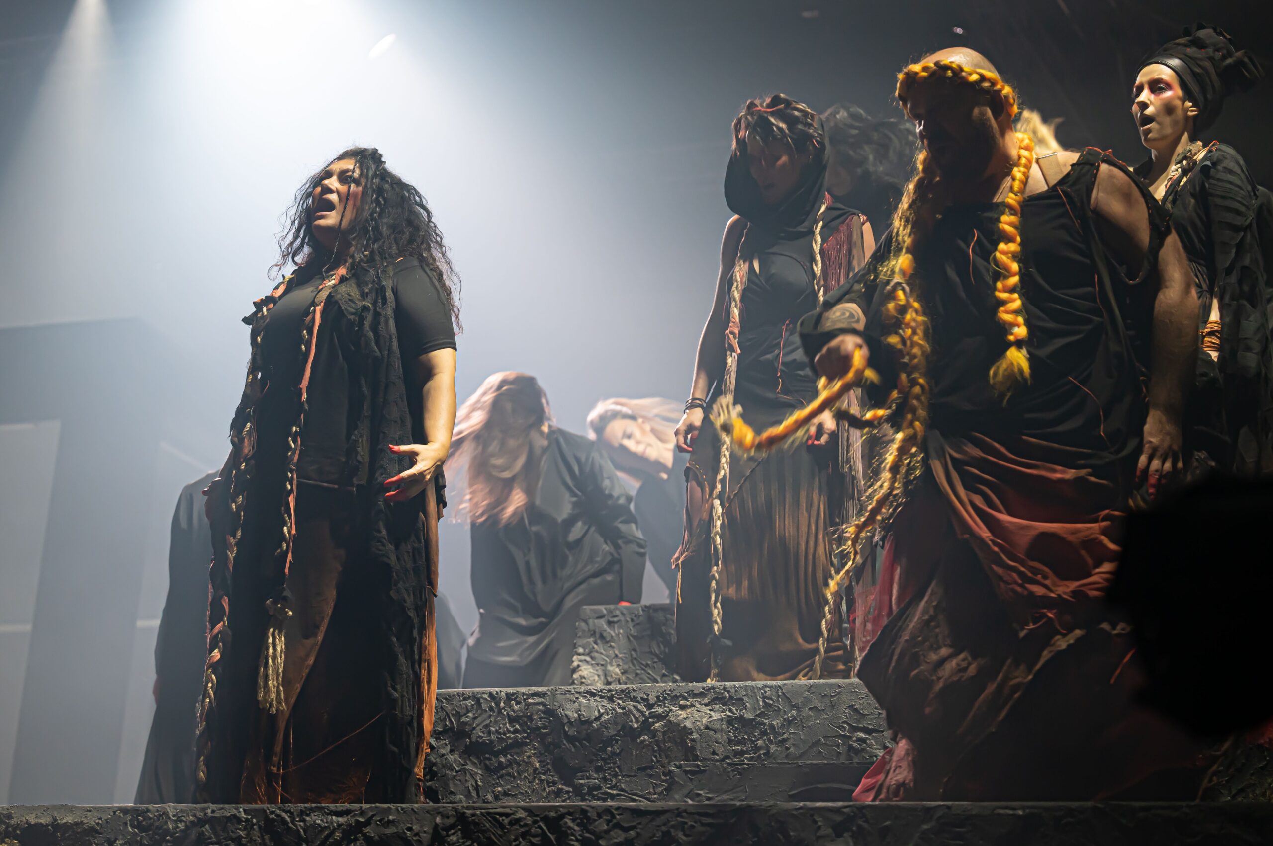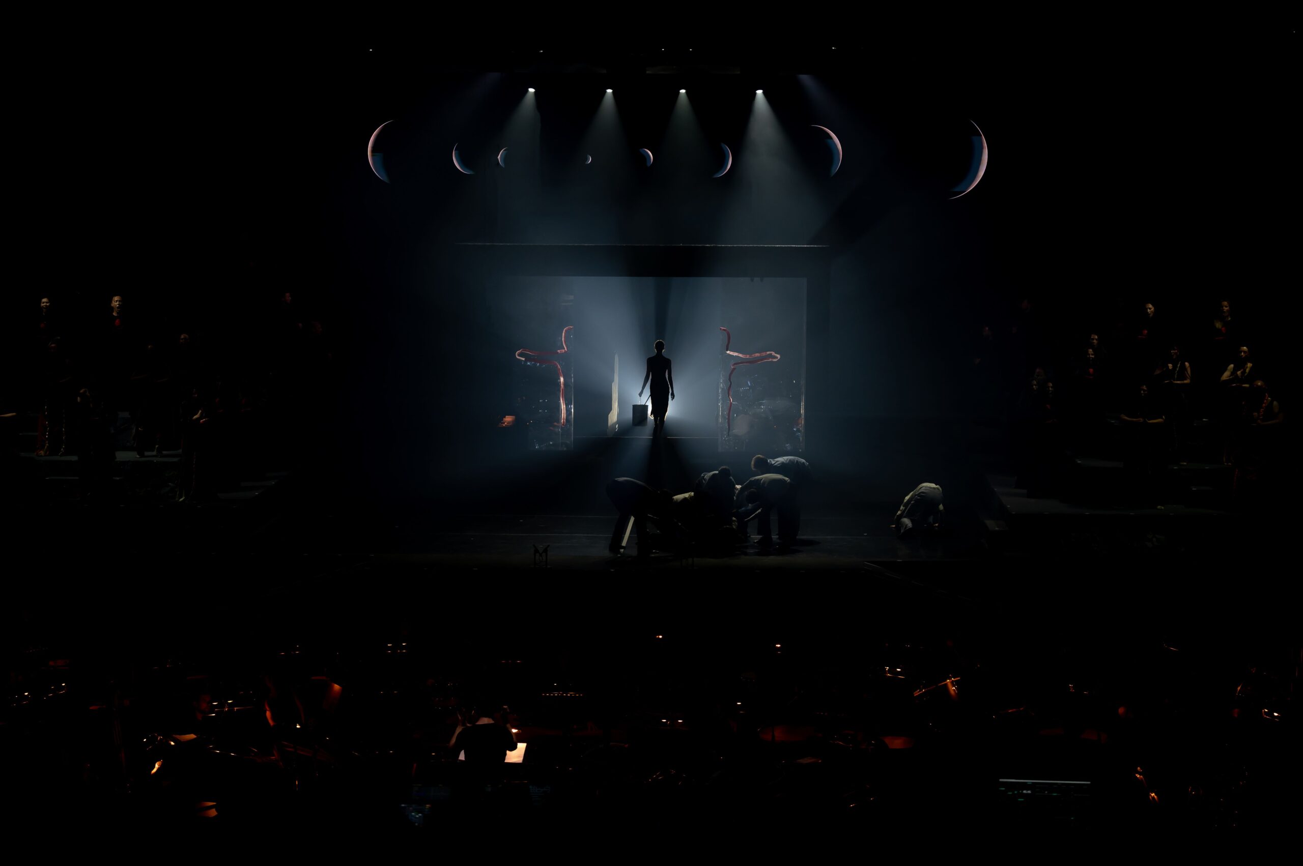 На Дягилевском зрители увидели колоссальную работу в фестивальном формате: сложная форма оперы в сочетании с ясным и четким нарративом, собранная с нуля сцена и зрительный зал в ангаре завода. На беглый подсчет около 100 человек на сцене: солисты, хор, статисты (к слову, непрофессиональные артисты), оркестр с участием полутора десятков ударных, более 20 работников за сценой. Вероятно, часть сложностей по репрезентации одного из фундаментальных мифов человечества, лежащего в основе произведения, удалось решить благодаря лаконичной форме: монохромная палитра на сцене, хор и световой луч как отдельные участники представления. Многочисленная массовка стала аранжировкой героического пафоса, основные музыкальные инструменты – ударные – создавали каркас музыкальной темы.