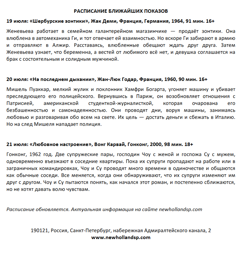 С 19 июля до конца летнего сезона, каждые вторник, среду и четверг на экране главной сцены Новой Голландии можно будет посмотреть классику мирового кинематографа, фильмы из фондов и архивов, а также фестивальные хиты. Начало сеансов в 19:30, рассадка на газоне свободная, вход на кинопоказы бесплатный. Показы могут быть перенесены в случае дождя.