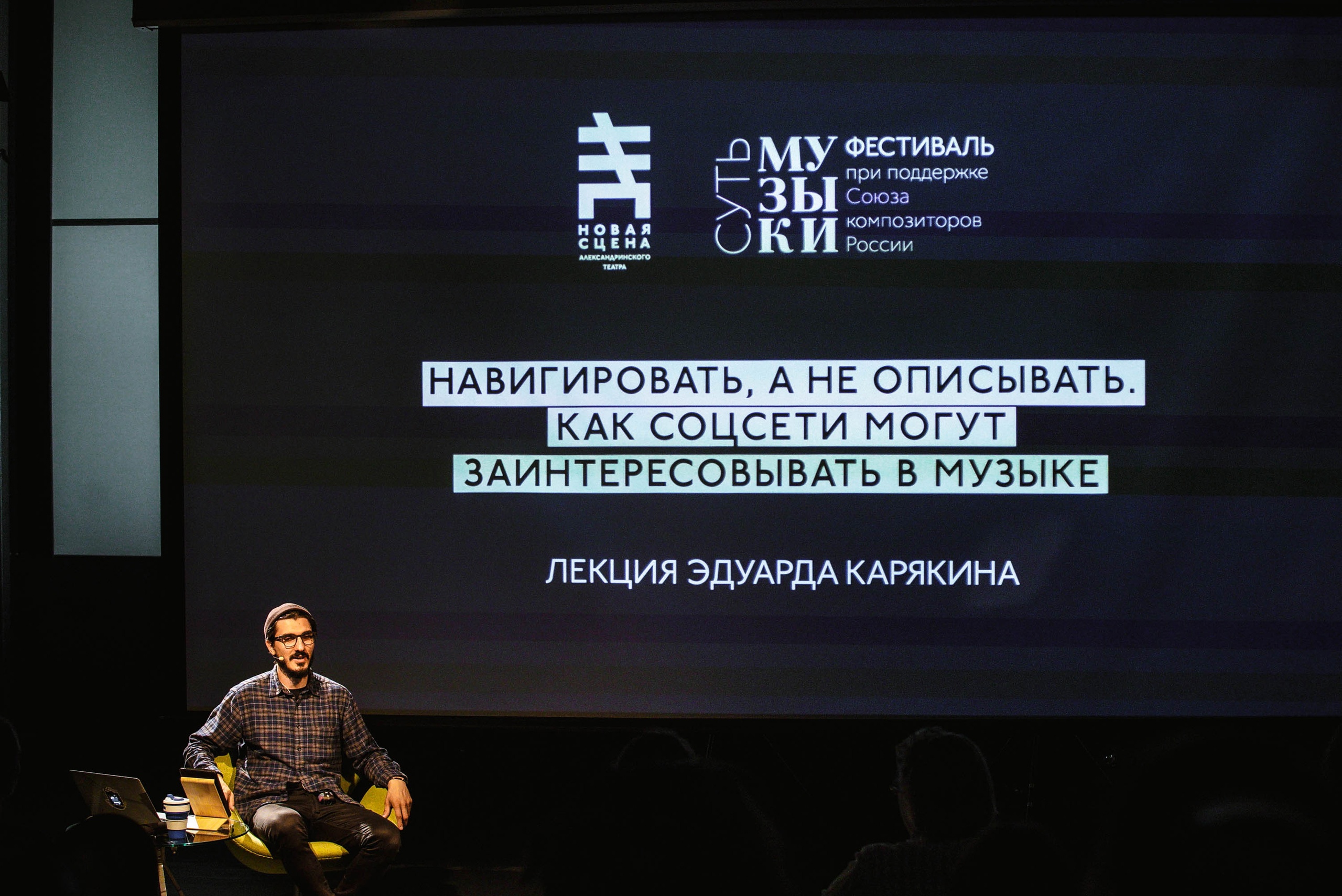 Следующий день открывала лекция «Навигировать, а не описывать. Как соцсети могут заинтересовывать в музыке» Эдуарда Карякина, руководителя маркетингового агентства для культурных проектов “Суть медиа” (вы можете увидеть их посты в соцсетях Союза композиторов и Театра Эстрады). Он вывел простую формулу