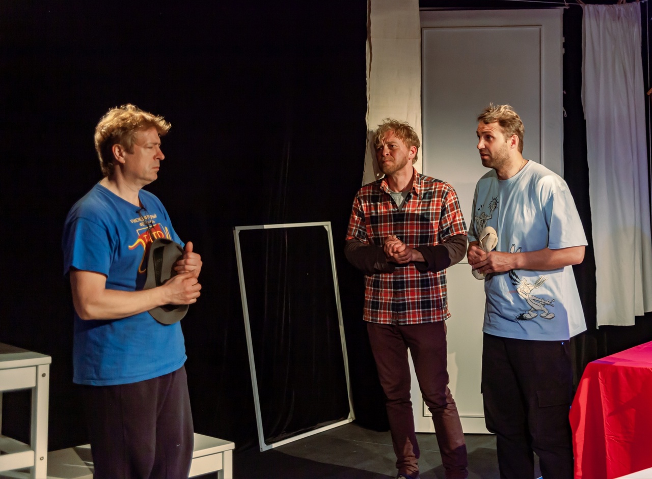 Фотография с репетиции спектакля «Самоубийца». Александр Маков, Александр Шведов, Роман Федоров