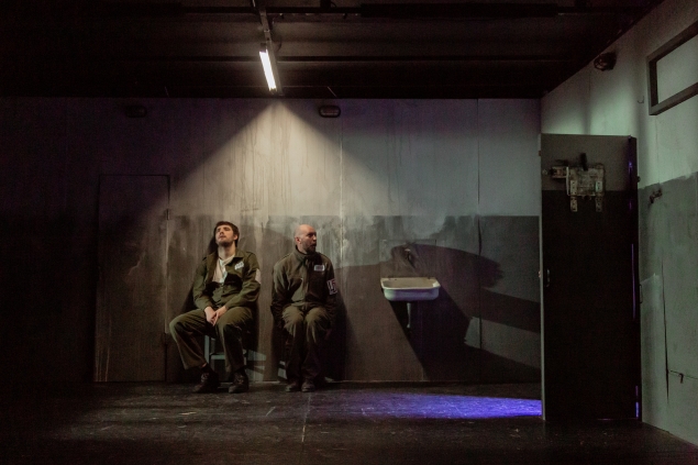 Вместе с ним зрители оказываются…в тюремной камере? Герои — в робах со штрихкодами, из интерьера — маленькое окошко с решеткой и пробивающимся тусклым светом, грязный унитаз с неработающим сливным бачком, нары, трансформирующиеся в дверь, обшарпанный стол… «Что за тюрьма такая, почему они ходят на работу?» — шепчет подруга, которая не читала (!) “1984”. О нет, Уинстон ещё не в тюрьме, он работает в Министерстве правды, официально переписывая прошлое. А сам, рискуя, ведет тайный дневник (запрещённые соцсети?) с критикой власти и.. влюбляется. За его спиной – многочисленные телекраны, не только орудие пропаганды и слежки, на них транслируются мысли Уинстона, и порой кажется, что всё происходит в его сознании.