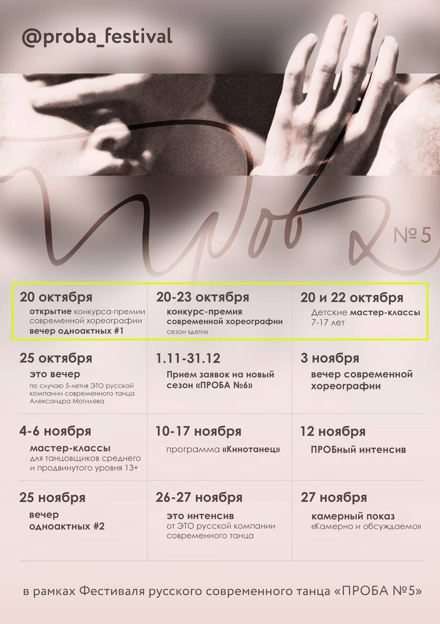 Также с 20 октября по 27 ноября пройдут мастер-классы от лучших хореографов России, а уже с 1 ноября Фестиваль запускает приём заявок на новый сезон «ПРОБА №6».