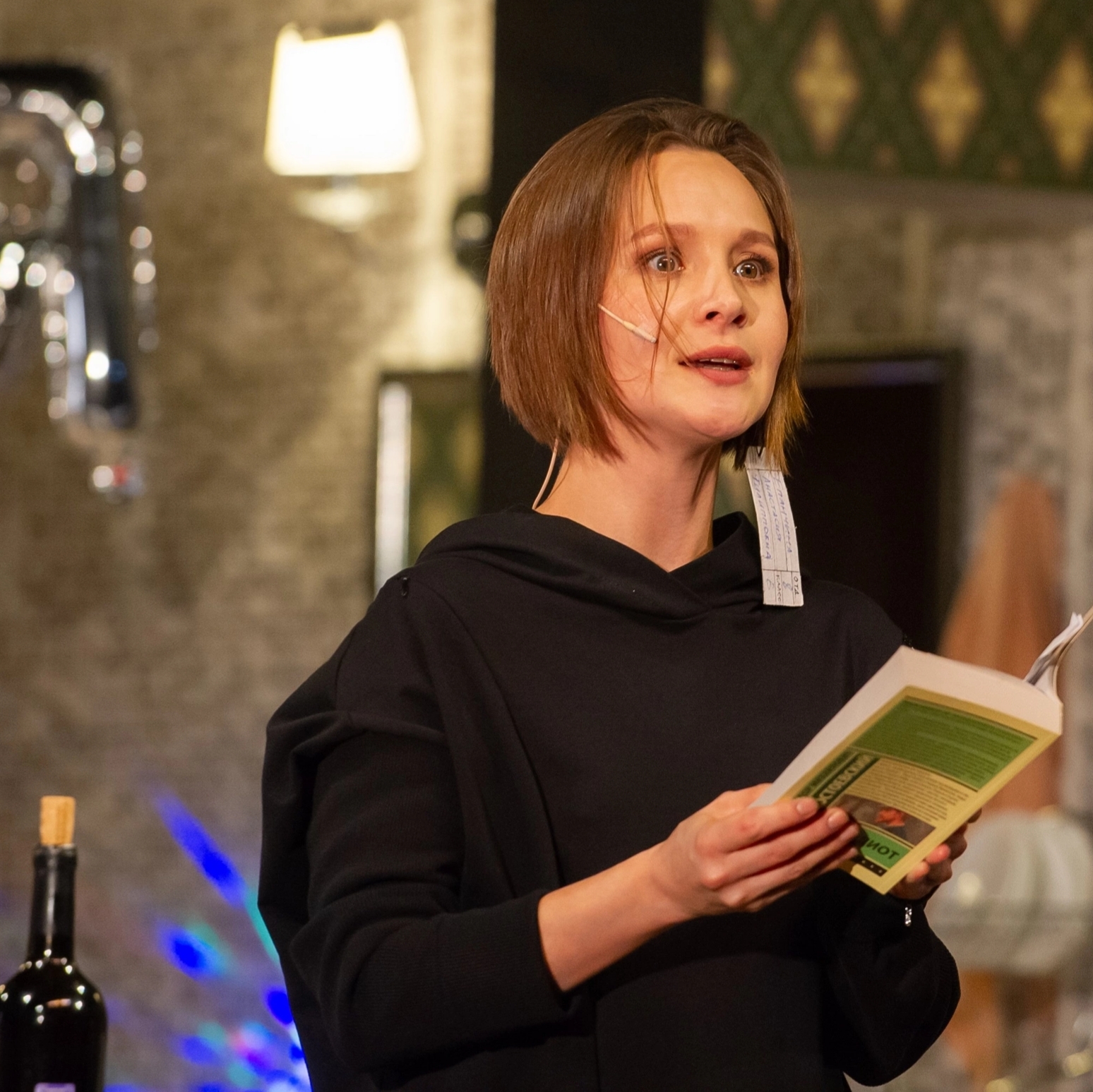 На полную мощь используются все возможности сцены-конструктора Приюта Комедианта — первое действие разворачивается в стерильном зале ожидания с креслами/условно-театральной гостиной Епанчиных, третье переносит в метафизический черный куб мыслей Парфена и Льва. А во втором акте художник Анвар Гумаров рушит стены-экраны, и зрители оказываются за фасадом благопристойности, внутри семейного праздника, в обстановке настоящей квартиры с узнаваемым ковром на стене и надувной деньрождественской надписью. Надпись эту не цепляют как по волшебству, а долго пытаются приладить. И вот в этой неловкой паузе, раздраженном поиске молотка, забивании гвоздей, полурепликах, поедании роллов из контейнеров от Dostaевский — столько правды и жизни, будто ты подсматриваешь за соседями. Ведь самое главное и настоящее происходит именно в таких паузах, в закусочной за поеданием шавермы, в обычной беседе в электричке с надоедливым незнакомцем, в пересказе странного фильма. И найти в себе силы, чтобы решиться рассказать о кошмаре, случившемся, когда тебе было 16, можно через много лет не на приеме психолога, а на торжестве…
