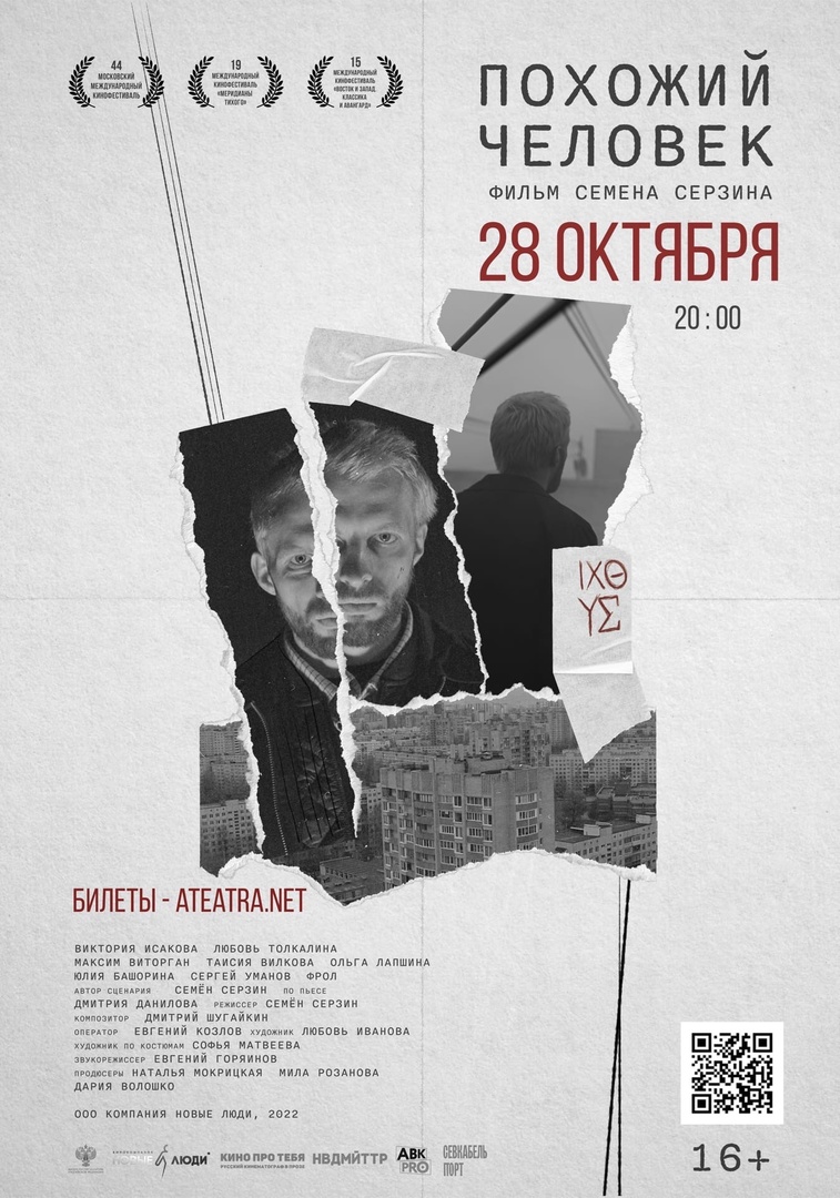 «Похожий человек», мой новый фильм, выходит в прокат 3 ноября, а 28 октября мы в рамках нашего проекта «Невидимое кино» делаем показ у нас на Кожевенной, 34, с обсуждением после, на котором будет драматург Дмитрий Данилов, я и актёры, которые участвовали в съемках.