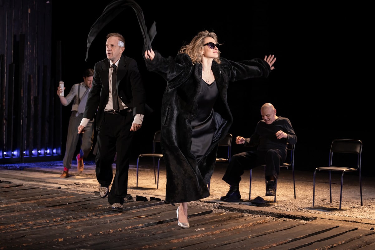 Из декораций на сцене — гигантский маятник-светило (всевидящее око?), то и дело начинающий движение. К середине появится огромный дохлый чёрный ворон — на него будут облокачиваться, рассаживаться, как на насест, чиновники — и можно будет почти ощутить смрад от разлагающейся туши, который им давно привычен. Красной нитью через весь спектакль проходит история о сбитом на дороге лосе, именно он — причина приезда “ревизора” и Осипа (Артём Осипов) в город — когда объятый ужасом Иван Александрович (Константин Райкин) будет бежать через весь лес не разбирая дороги. А тяжелое дыхание умирающего зверя (умирающей страны?) будет постоянно звучать фоном в спектакле.