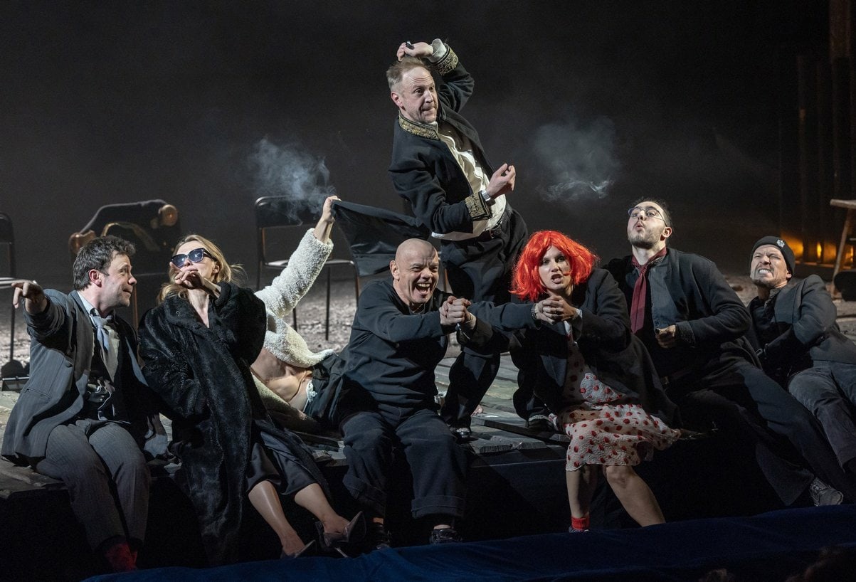 В финале множество душ — и мертвых, и живых — выходит и рассаживается на сцене, постепенно заполняя все пространство, и трясутся в огромной невидимой машине, которую ведет Городничий. И машина эта несется прямиком в ад.