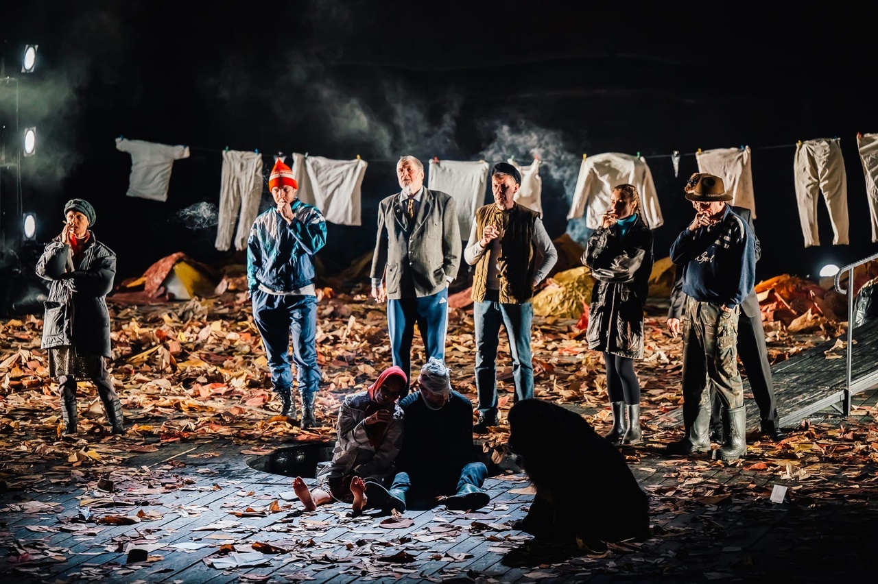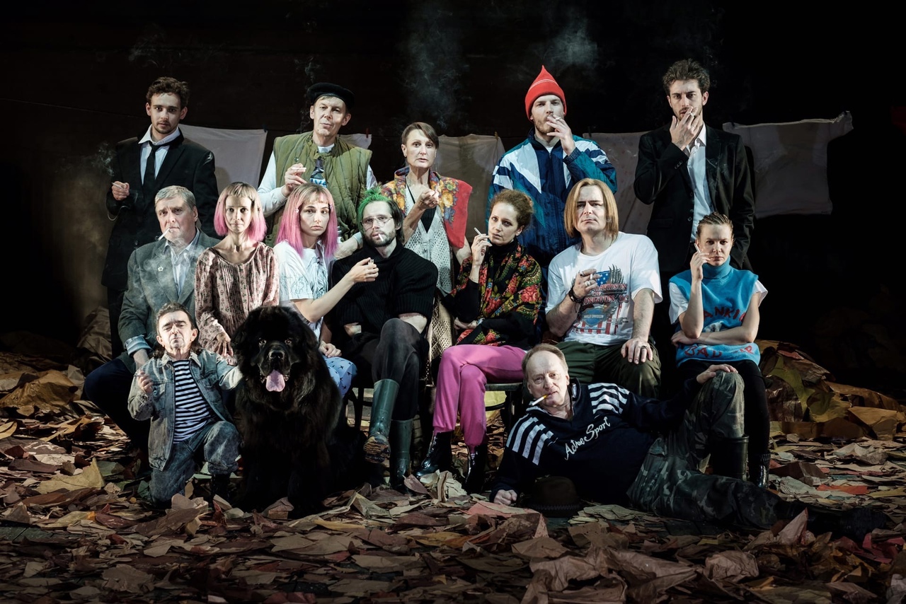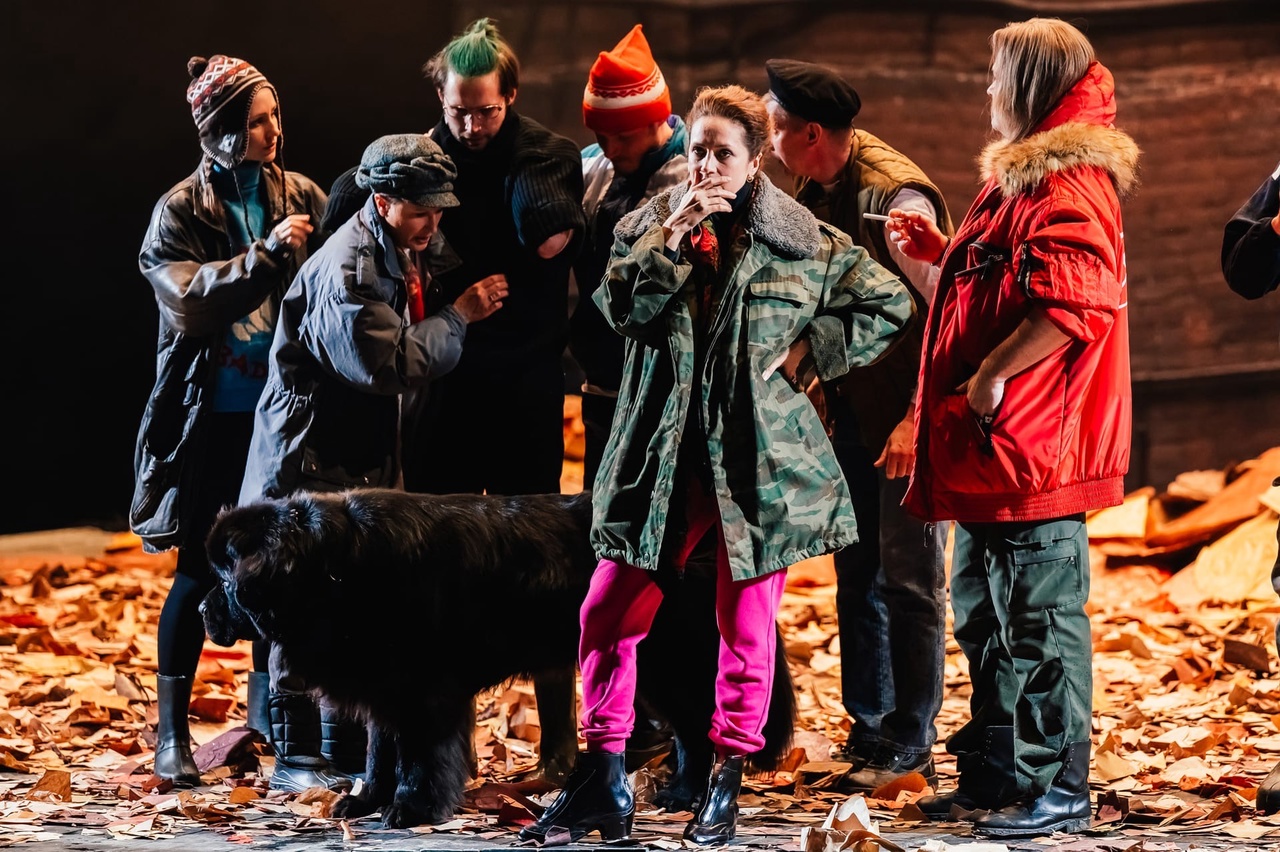 Постепенно обитатели дачи спускаются на сцену вместе с огромным чёрным псом и выстраиваются в ряд, давая зрителям возможность угадать, кто есть кто. Выглядят они… как все мы на даче, в резиновых сапогах, трениках. Хм, ну допустим, Аркадина — Вика Исакова (номинация на “Золотую маску”-2023) в шали и камуфляжной куртке, это мы узнали из программки. Она в спектакле — вышедшая в тираж эстрадная певица, помесь “примадонн” русской сцены, пробивная бой-баба, которая выгрызла себе место под солнцем и ещё греется в остывающих лучах популярности.
