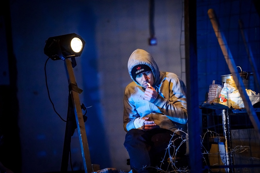 Завораживают первые секунды спектакля – два человека в совершенно разных, но у каждого по-своему страшных ситуациях, сидят и смотрят друг на друга. Актерская работа в «Секторе Газа» филигранно-точная, Иван Решетняк и Виктор Бугаков создают (мы не знаем из скольки на самом деле собранных) живых людей из плоти и крови, которые балансируют на языке (суржике с одной стороны и плохо выученном от старшего поколения русском с другой). Они не совпадают по темпераменту, не совпадают по атмосфере, это столкновение и выстраивает ансамбль.
