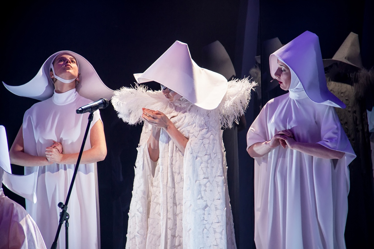 Шум моря. Крик чайки. Пастор на белоснежном диване (художник Сергей Илларионов). У микрофона замерла монахиня в белоснежных одеждах. Спектакль начинается ещё до того, как зрители расселись на свои места. Прологом идёт сцена бастующих против патриархата монашек — в программке они обозначены как Гельт (Наталия Басистая); молодая госпожа; первая госпожа, мать 36-ти детей; вторая госпожа, пожилая старая дева. Они ярко пропевают свой протест в глубине сцены, подкрепляя слова игривыми танцами (хореограф Полина Митряшина). С ними безуспешно (он в явном меньшинстве и намного тише) пытается полемизировать некто Старший. Вдруг свет мигает (художник по свету Андрей Лебедь) и перемещается на передний план, к пастору в исполнении Ивана Байкалова, сидящего до этого в темноте на авансцене.