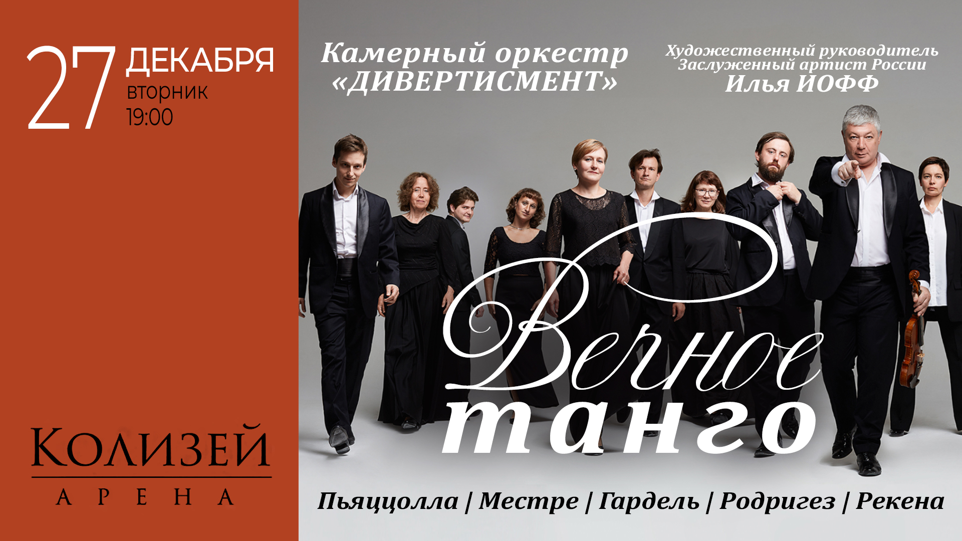 Камерный оркестр «Дивертисмент» в предновогодний вечер исполнит для вас одну из лучших своих программ «Вечное танго» в «Колизее» 27 декабря.