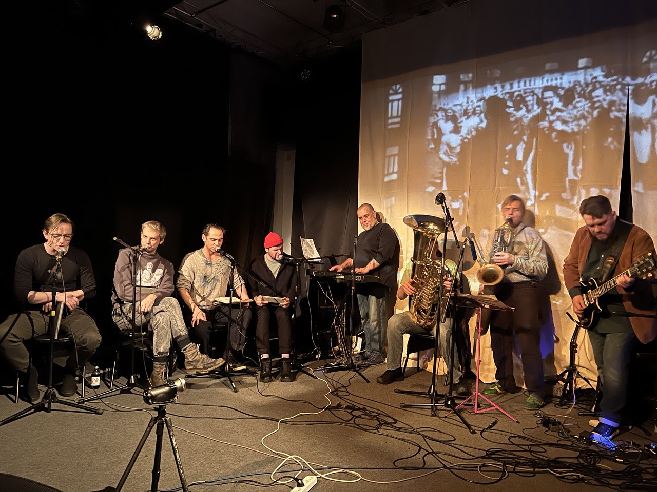 Текст Хармса в этот вечер читали и пели: свет моих глаз и причина бессонных ночей Вячеслав Коробицин, актёр и режиссёр Роман Кочержевский (про его спектакль «Утиная охота» я как-то писала), а так же Григорий Чабан и Андрей Феськов, с которыми мы никогда прежде не встречались. Создавали лирическое и драйвовое настроение музыканты Владимир Волков, Дмитрий Озерский, Михаил Коловский, Николай Рубанов, Николай Бичан, Денис Сладкевич и Олег Шавкунов. Чувствовалось, что все участники кайфуют от происходящего и рады быть здесь, это передалось и слушателям. Стихи и музыка погружали в медитативное состояние, хотелось улыбаться, а у нас сейчас слишком мало поводов для улыбок. Перезагрузка абсурдом и радостью была необходима.