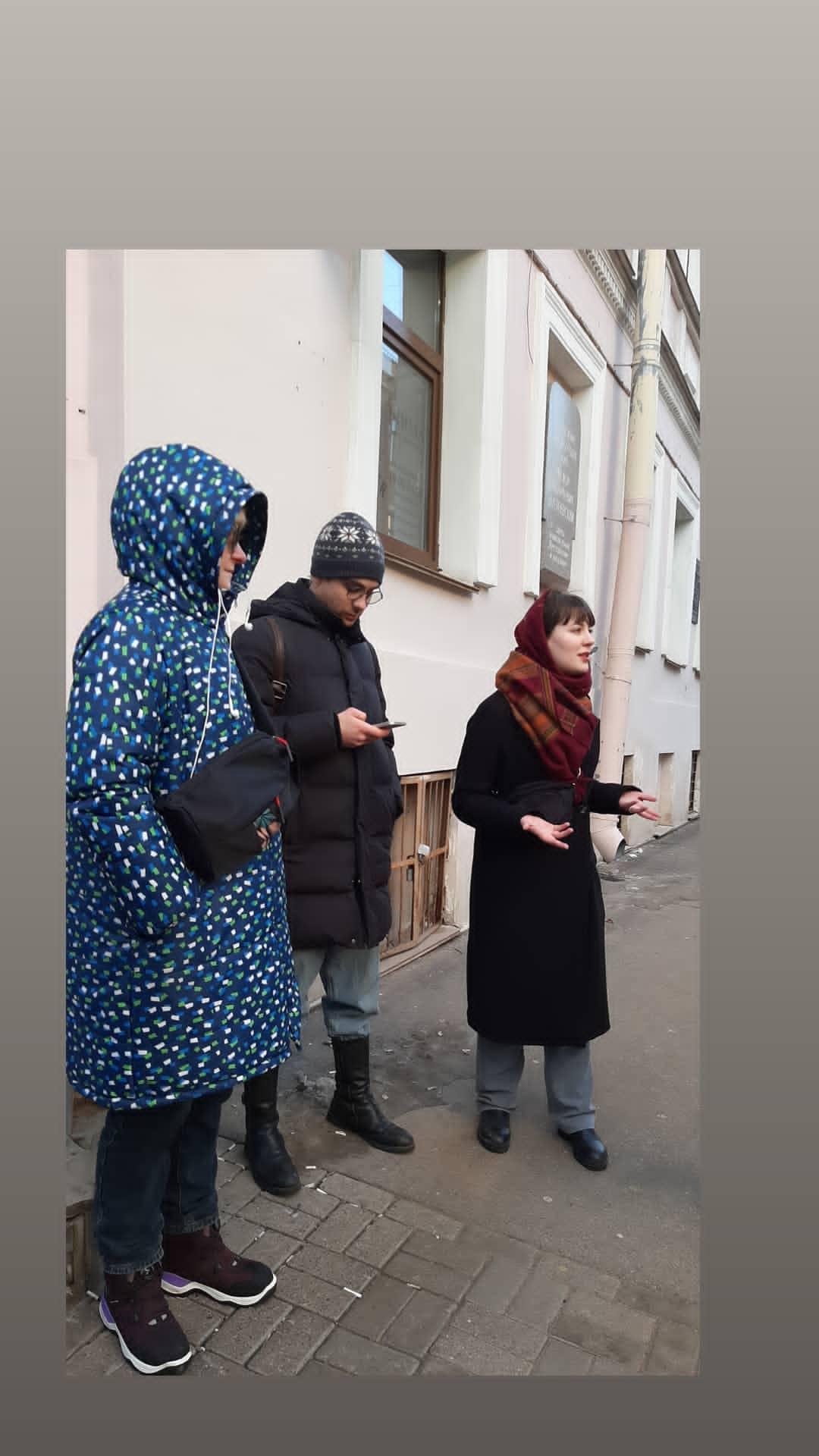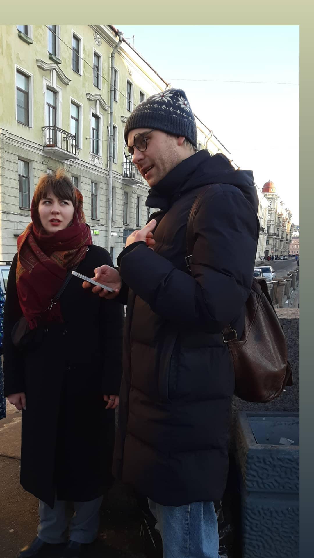 Я как будто всё время куда-то опаздываю: Вячеслав Коробицин и Дарья Мовельян начали водить спешие спектакли еще в теплом, цветущем даже в 2022 году мае, я читала отзывы подруги об этом проекте, а сама спохватилась только на границе лета и осени, когда выяснилось, что Слава уже не участвует в прогулках. Но все же я дождалась: 26 декабря Гостиная Хамс совместно с Домом Лурье провела спектакль «Сон Феди» для сильных духом и морозоустойчивых. Нас было семеро, включая актёров, а ещё одним участником был сам Петербург, морозный, сказочно и болезненно красивый, украшенный к Новому году, с его обветшалыми домами и обледеневшими набережными, глыбами льда, застрявшими в водосточных трубах.