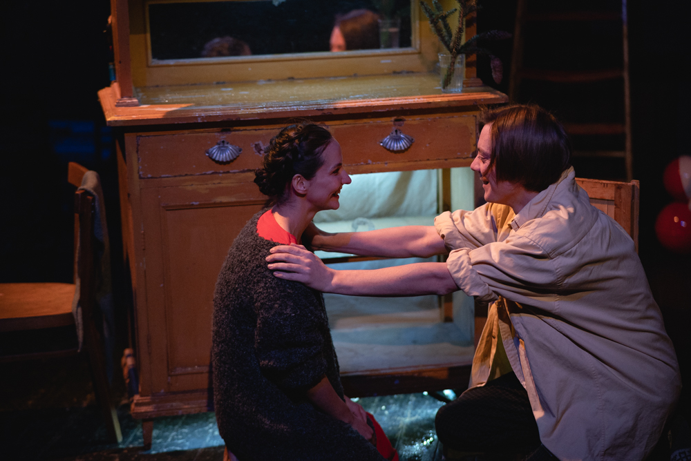 На поделенной пополам сцене четверо: Ксения Пономарева-Бородина, Максим Максимов, Ренат Шавалиев и Михаил Шеломенцев. С одной стороны трое мужчин (они сыграют и ангела, и Ирода, и волхвов), у каждого по музыкальному инструменту (аккордеон, барабаны и гитара), с другой, отделенной косой стеной с дверью – Ксения Пономарева-Бородина – Мария. Большую часть ее половины занимает огромный старинный сервант. Трёхуровневый, с закрытыми дверцами, он и становится вертепом. Сюда в застекленный верхний ящик поставят фигурку Марии, а, наоборот, в самый низ, в «подземный этаж», — граненый стакан, который олицетворяет царя Ирода (когда дверцы буфета откроют снова, стакан загадочным образом исчезнет, а на его месте будет гора осколков).