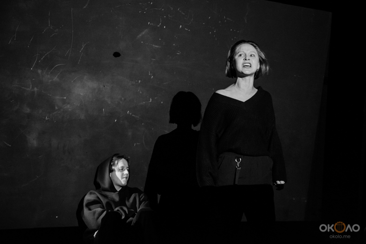 Вторая часть — знакомство с персонажами, решена в эстетике онлайн-кино, излюбленном приеме Петра Юрьевича в последние годы. Все неважные детали отсечены. Только крупные планы и тончайшие нюансы человеческой психики. Чёрное Ничто, бездна, смотрящая на тебя (художник Анвар Гумаров, свет — Юрий Соколов), в которой мерцают души человеческие. Спорим, вы вспоминали метафизические диалоги в чёрном кубе в “Идиоте” Петра Юрьевича в Приюте комедианта, самой яркой и обсуждаемой премьере сезона?