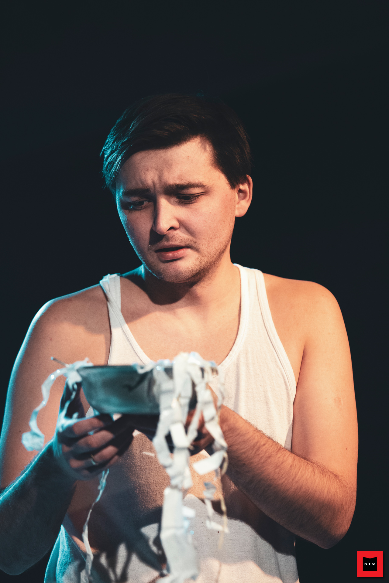 Жители этого странного, но очень знакомого мира едят только обрезки бумаги — словно пропущенные через шредер страницы запрещённых книг. В них же они спят, моются, это всё, что им доступно. То и дело в спектакле слышна мелодия из передачи «В гостях у сказки». Наше телевидение транслирует это шоу нон-стоп. И в результате получилось, что некоторые люди людьми перестали быть.