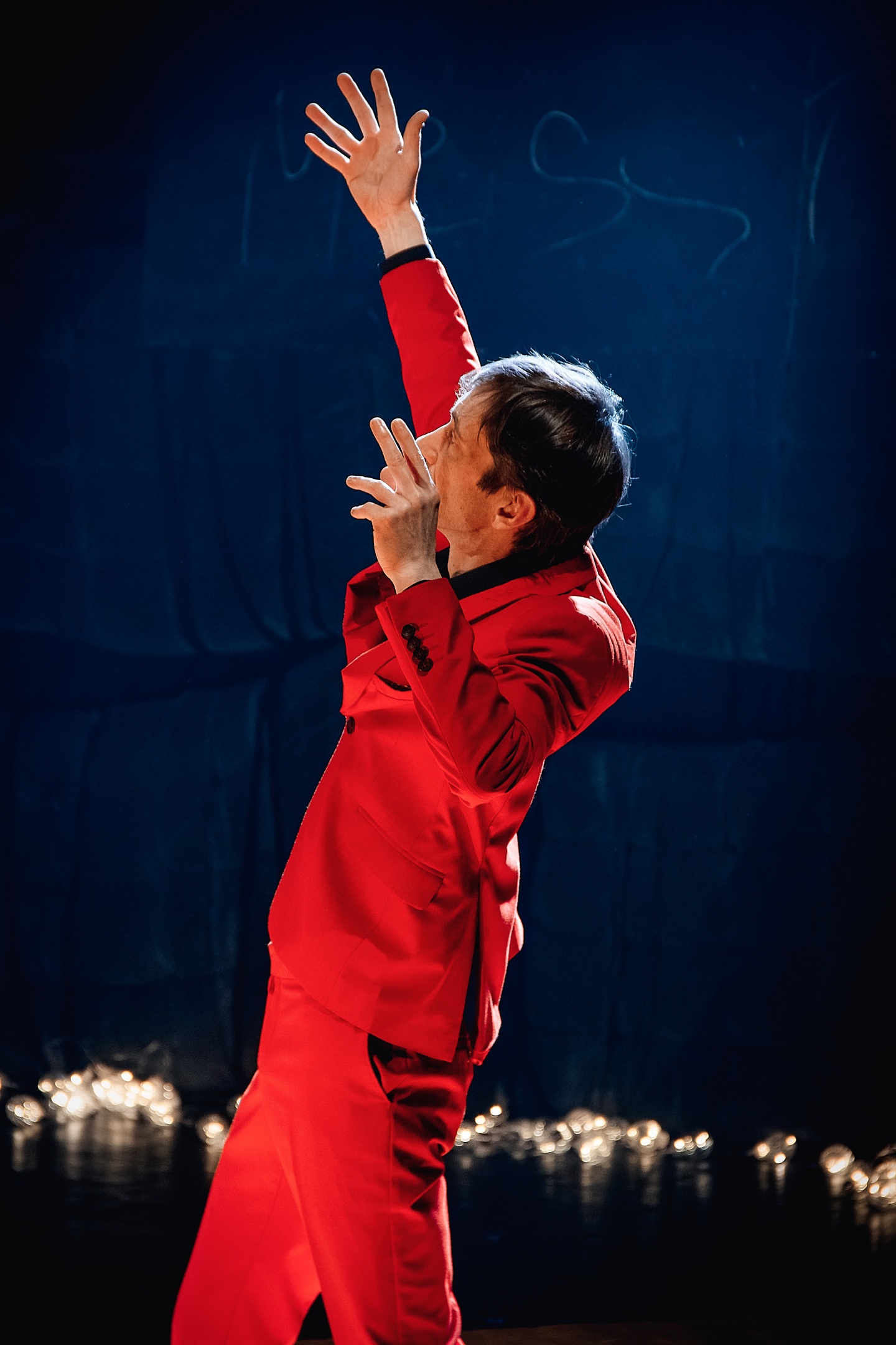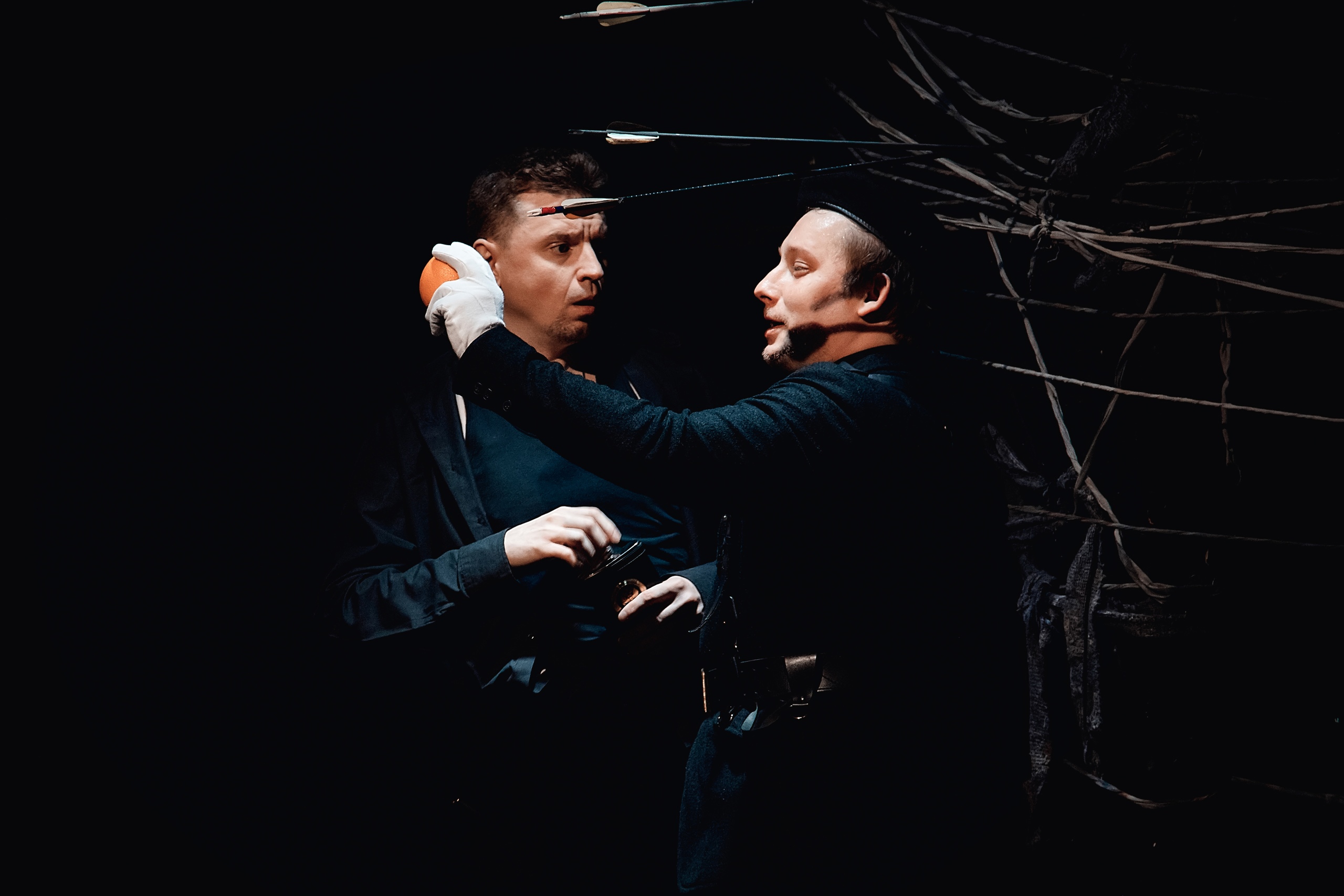 Спектакль начинается с того, что двое сидящих в зрительном зале актеров со стрелами в груди (Григорий Сергеенко и Артем Лисач) ведут диалог о том, каково это — умереть. Благодаря кольцевой композиции они же станут тем самым многоточием в конце спектакля, после которого вопросами о жизни и смерти предстоит задаваться уже зрителям. Через этот актерский дуэт и подбрасываемую в воздух монету вводится основной закон постановки – игра в игре.