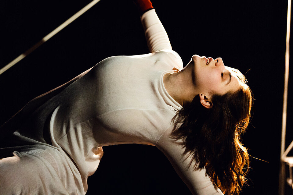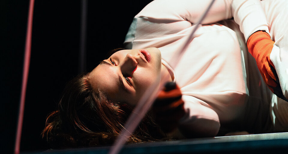 Впрочем, к свету есть и другие вопросы. Например, стоит ли так явно выделять в темноте столбы пыли, поднимающиеся к потолку при взмахивании верёвками? Необходимо ли окрашивать сценическое пространство в ярко-красные тона, когда героиня упоминает красный ошейник собаки или красное лицо старушки, хотя эти словосочетания, казалось бы, не несут существенной смысловой нагрузки? Наконец, зачем, символизируя молчание собеседника героини на другом конце провода, слепить зрителя, долгое время просидевшего в темноте, четырьмя направленными ему в лицо прожекторами? Оригинально и красиво оформлена лишь финальная сцена спектакля, когда актриса совершает плавные движения в снопе быстро мигающего света, и кажется, будто она плывёт по волнам, а потом зависает на канатах, словно вынесенная на берег.