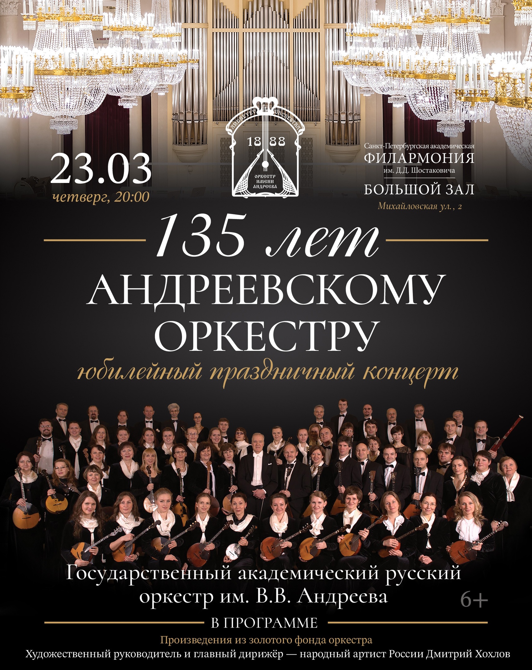 23 марта, в 20:00, в Большом зале Санкт-Петербургской академической филармонии им. Д. Д. Шостаковича пройдет юбилейный праздничный концерт «135 лет Андреевскому оркестру».