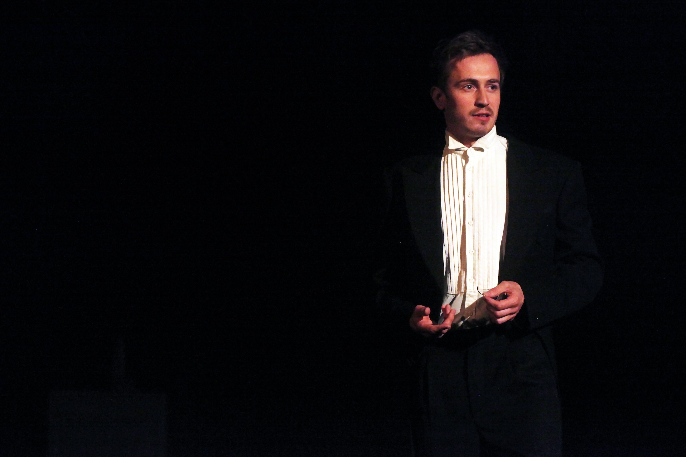 Сцена погружена в темноту, которую прорезают лучи света. Актеры в черных одеждах, из мебели — ящики и шкаф, на котором стоит метроном. Вдруг из шкафа появляется кукла-девочка, закутанная в платок. Она заводит патефон в шкафу и весело качает головой в такт метроному. Но раздается взрыв, девочка исчезает, открывается книжный шкаф и из него выпадают книги. На сцене появляется актер, который медленно и аккуратно облачается во фрак. Это скрипач, Лев Маргулис, он больше не ходит в бомбоубежище, а сидит на крыше, вздрагивая от взрывов. По сцене медленно бредут, качаясь, останавливаясь и осматриваясь куклы — блокадники. Их лица серые и изможденные, они одеты в многослойное тряпье. Куклы в этом спектакле изображают всё то страшное, физически страшное, что было в блокаду.