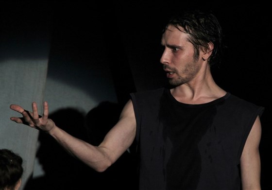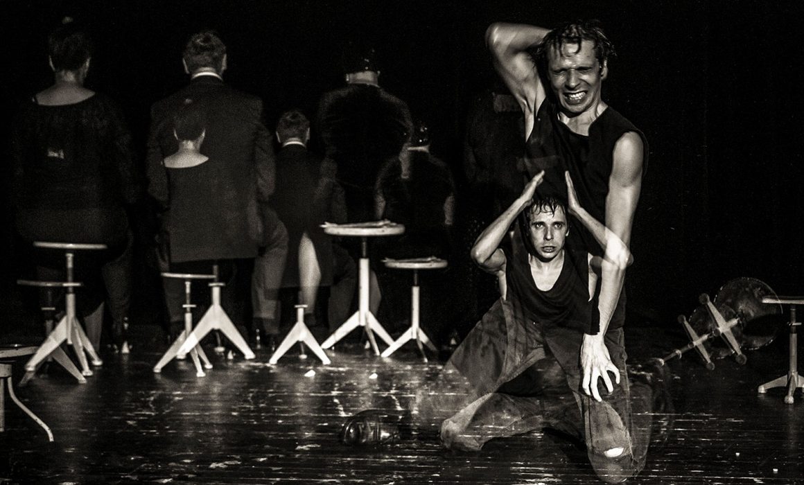 Первым к зрителям выходит счастливый безумец, обитающий при оркестре — Маню (Даниил Шигапов). Пожалуй, самый яркий персонаж спектакля – за пять минут он по-французски рассказывает и показывает всю историю мирового театра. Неврологические мышечные зажимы и резкие движения руками, непонятная и сбивчивая речь, из которой удается выхватить отдельные слова и фразы: комедия дель арте, Арто, Брехт, Станиславский, Товстоногов, Гротовский, Высоцкий. То, что могло бы стать диалогом со зрителем, превращается в шокирующий монолог, сопровождаемый жуткими действиями, включающими, например, ножевые ранения и льющуюся кровь. Маню – и символ, и человек, вызывающий сочувствие, и пугающий своим непредсказуемостью психотик.