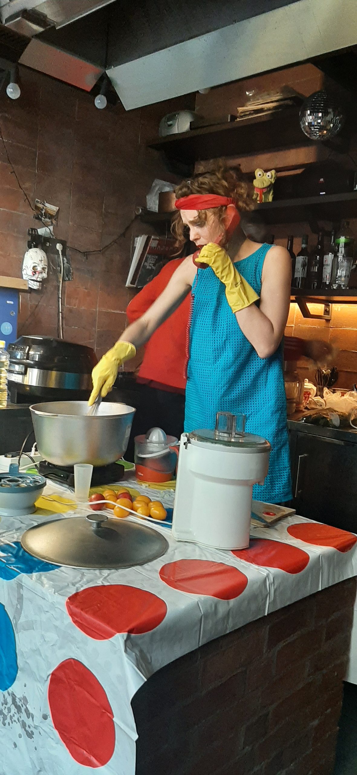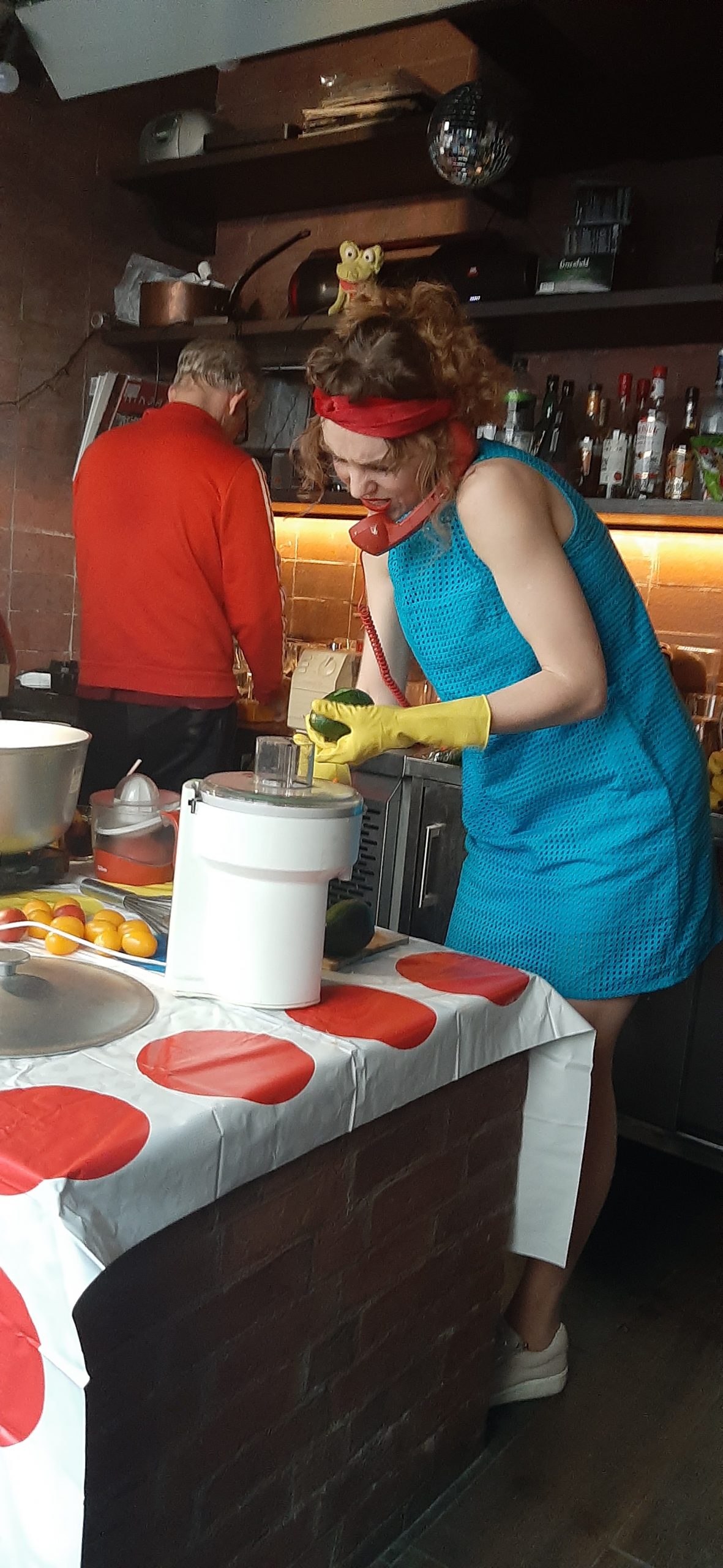 Барными спектаклями сегодня никого не удивишь — у Семена Александровского целая трилогия на эту тему. Готовят во время спектакля тоже довольно часто — вспомним хотя бы «Донецк. Вторая площадка» Анатолия Праудина и «Фаина. Эшелон» Иосифа Райхельгауза — во время действия актёры варят борщ и в финале угощают желающих. Камерных спектаклей можно вспомнить немало — в театре «Блоха» умещаются шесть зрителей, актёр и администратор, есть даже спектакли, рассчитанные на одного человека, тот же «Буковски за барной стойкой» Pop-up театра. Спектакль Александра Машанова «Философия Энди Уорхола» с актрисой СХТ Анной Дразниной в главной и единственной роли сочетает в себе все эти формы. Плюс это постановка в стиле пин-ап, героиня похожа одновременно на всех задорных женщин с известных плакатов.