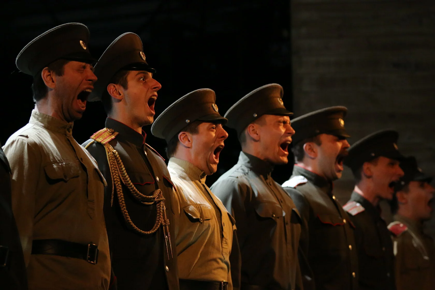 Первое, что хочу сказать — это бесконечно красивый спектакль: на военную выправку, осанку и стать офицеров и солдат можно смотреть бесконечно. Они маршируют, поют песни (все знают, что «Мастерская» — самый лучший поющий театр из драматических), беззвучно кричат (мы тоже кричим, но наш голос не слышат) и танцуют. В спектакле я увидела всех героев именно такими, какими представляла их в пьесе. Алексей Максима Фомина благороден, утончен и красив. Максима я нежно люблю после спектаклей «Топливо» и «Разговоры беженцев», всегда радуюсь, встречая его на улице или в фейсбуке. Впервые увидела Максима в постановке большой формы и хочу сказать, что он органично и искренне существует в любом пространстве. Я в материале, поэтому знала, какая судьба уготовлена Алексею, но всё же оплакивала его. Война не считает жертв, она ими питается, но мы — люди, для нас каждая жизнь священна, это не просто ещё одна цифра в статистике.
