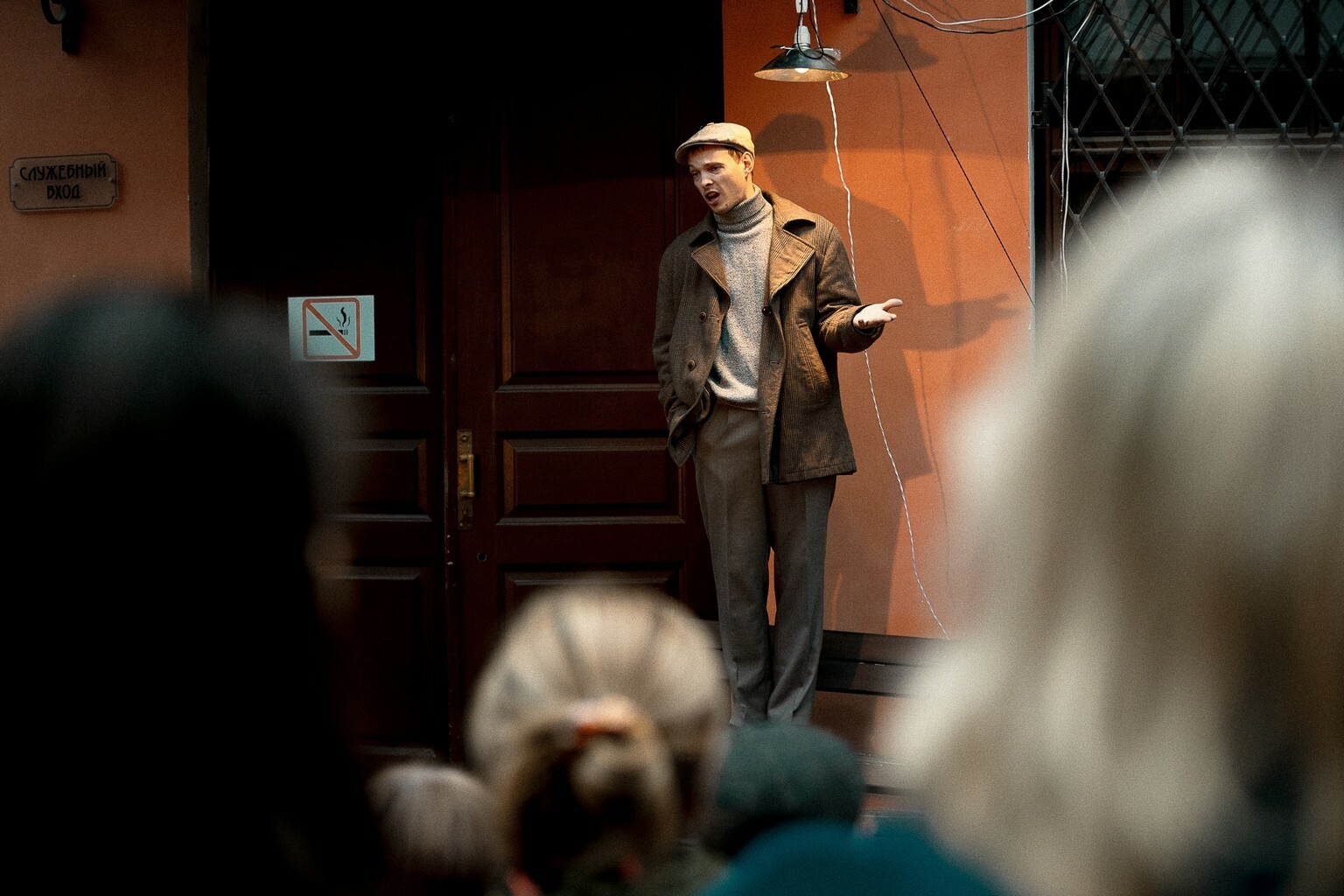 На сцене — один актер (Евгений Серзин). Он размашисто влетает в зал и исполняет знакомую каждому весенне-пронзительную “Бывает все на свете хорошо”, слушая которую, хочется улыбаться во весь рот. Но через пару мгновений песня оборвется… Смертью поэта. И перед зрителями словно отматывается старая кинопленка воспоминаний Шпаликова, а он уже взлетает (вообще-то на подоконник, но будто парит в небе, как персонаж картины Шагала “Над городом”, влюбленный в Москву). С по-детски беззаботной восторженностью Шпаликов описывает здания, жителей, улавливая и транслируя настроение родного города. Герой заговорщицки делится мыслями и воспоминаниями со зрителями, тоскует из-за трагической любви, размышляет о дружбе и правде. Его повествование порой бессвязно-фрагментарное, как поток сознания, как россыпь разноцветных стеклышек, постепенно сливающихся в калейдоскоп под ностальгические мелодии аккордеона (Павел Чернейкин).