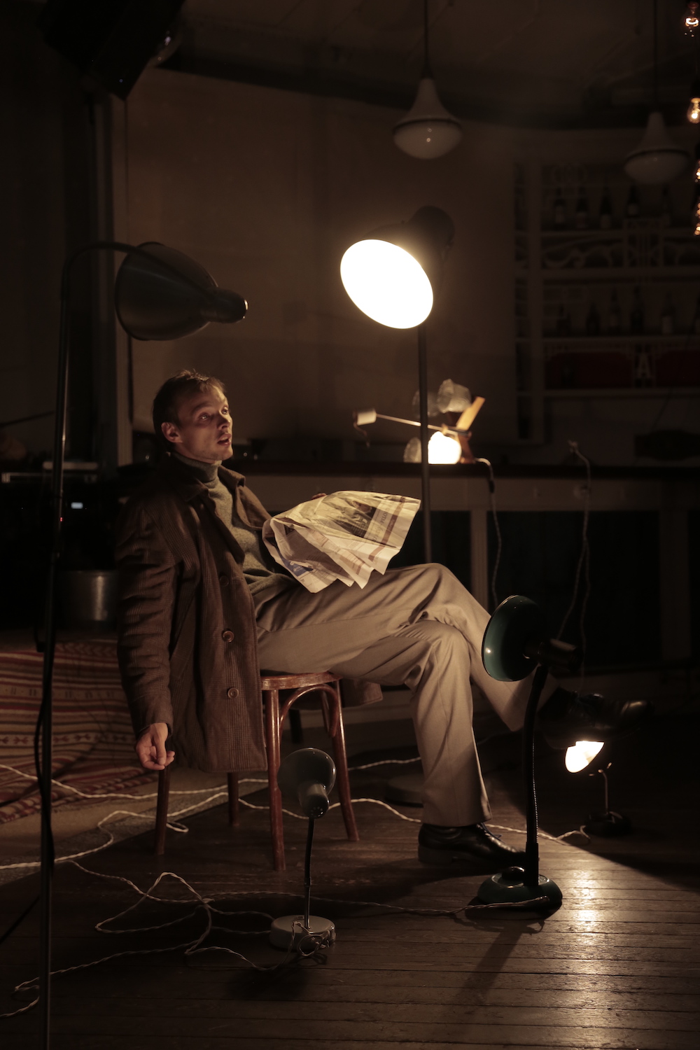Перещелкиваются, подмигивая, лампы самых разных форм и размеров, Серзин-Шпаликов то яростно приближает их к лицу, как на допросе, то будто подсвечивает серый мир вокруг нежным сиянием поэзии. Образ света, к которому тянется Шпаликов — ещё один герой спектакля наряду с аккордеоном.