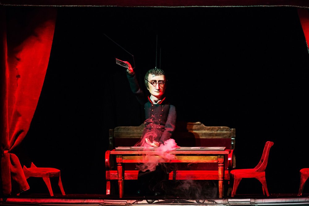 В спектакле «Пиковая дама» редко можно увидеть людей, основное действие реализуют куклы: большая, в пышном платье и с красными губами, жестокая Графиня, тоненькая и беззащитная малышка-Елизавета, тощий и сломленный тяжёлой жизнью и бедностью Герман расскажут нам историю. Это история о том, как слаб человек, как он не может справиться, ужиться со своими демонами, перестать разменивать свою жизнь на ненужное, неважное, мимолетное.