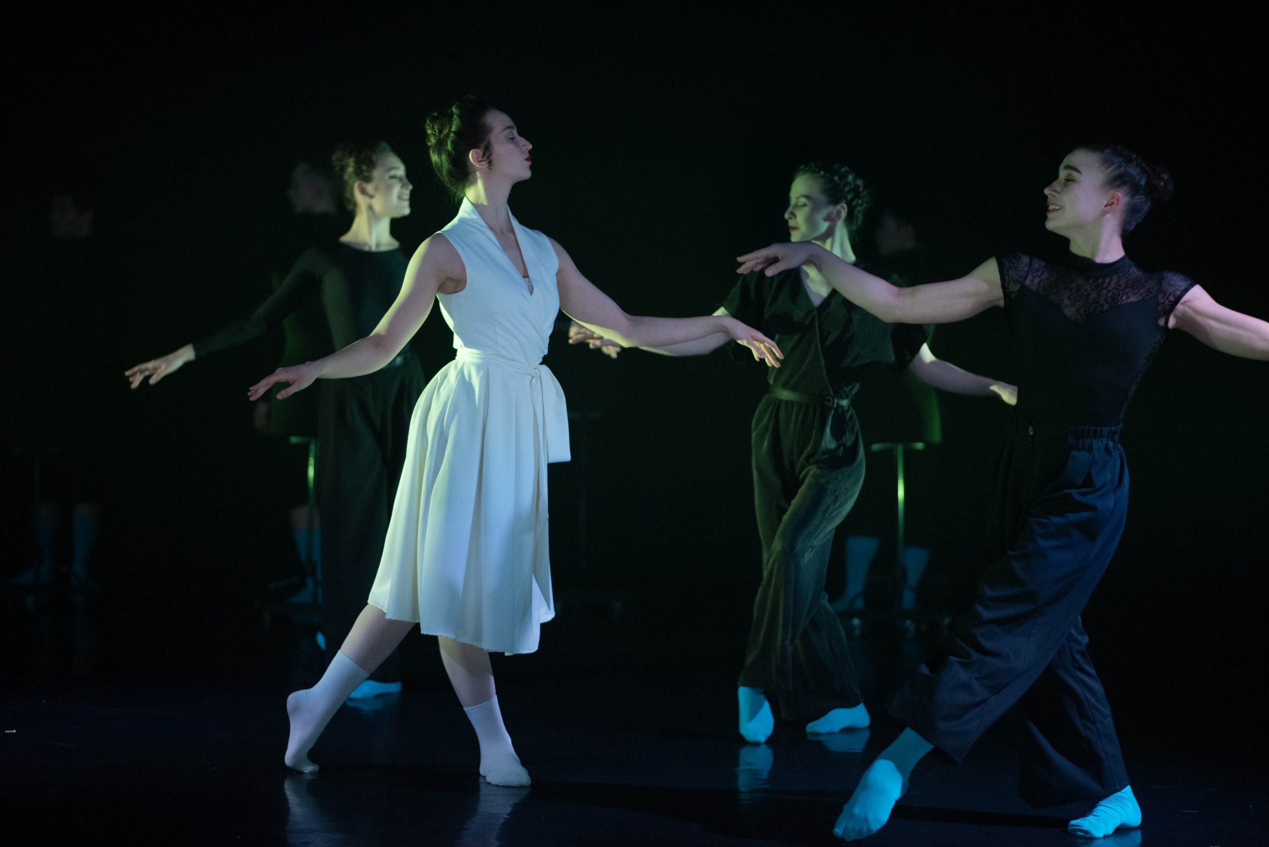 Спектакль начинается как идиллическая пасторальная картина: под щебетание птиц, а затем звуки музыки Вивальди, Боккерини и Маре, девушки в корсетах оказываются на балу. Последующий танец с партнерами, в дуэтах и сольно, не классический бал, а пародия на этот ритуал, созданный для того, чтобы можно было найти себе подходящего партнера, посплетничать или громко посмеяться над тем, кого выбрали объектом насмешек.