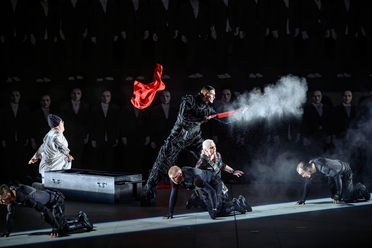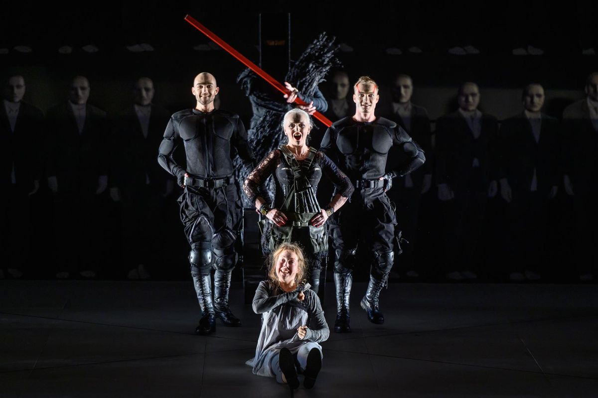 Что за спектакль родился из такого сотрудничества? В “Мамаше Кураж” есть рассказчик — пожилой мужчина в черном, народный артист России Николай Мартон. Сначала кажется, что повествование ведется от лица смерти, но смерть появляется скоро. Это атлетически сложенный красивый юноша Дмитрий Бутеев. Поют в спектакле много хором и сольно, звучат зонги немецкого композитора, соавтора Брехта Пауля Дессау и музыка греческого композитора Панайотиса Велианитиса. Актёры то ходят маршем, то движутся по сцене гибко, пластично, медленно. Возможности Александринского театра и масштабы сцены позволили реализовать все режиссерские задумки. Терзопулос перенес действие в будущее. “Это нечто уродливее, чем то, что происходит в наше время, но тут много юмора, что создает баланс.” (интервью режиссера ТК Санкт-Петербург. 15.02.2017). Костюмы и декорации режиссер придумал самостоятельно. Солдаты выглядят футуристично, будто спустились с космических кораблей поучаствовать в Четвертой мировой. Декораций не много, но все хорошо видно с последнего ряда верхнего яруса — огромная труба, цинковый ящик, спускающиеся с потолка то ли стены, то ли ножи гильотины, ряды человеческих фигур в полный рост на заднике. Спектакль выдержан в трех цветах — черный, алый, белый. Костюмы будто из гардеробной модного дома Balenciaga. Дерзкое сочетание складок, дыр, кожаных ремней, защитных элементов, асимметрии и голого тела. Поджарая, седовласая Мамаша Кураж (Заслуженная артистка России Елена Немзер) — не жертва противостояния, а алчная, расчетливая хозяйка положения, готовая торговать и нашим, и вашим. Ведет свой фургончик по линии фронта, невзирая на смерть собственных детей. Происходящее масштабно, дорого, громко, пафосно, иронично, наполнено метафорами, образно, при этом остро-социально, созвучно действительности.