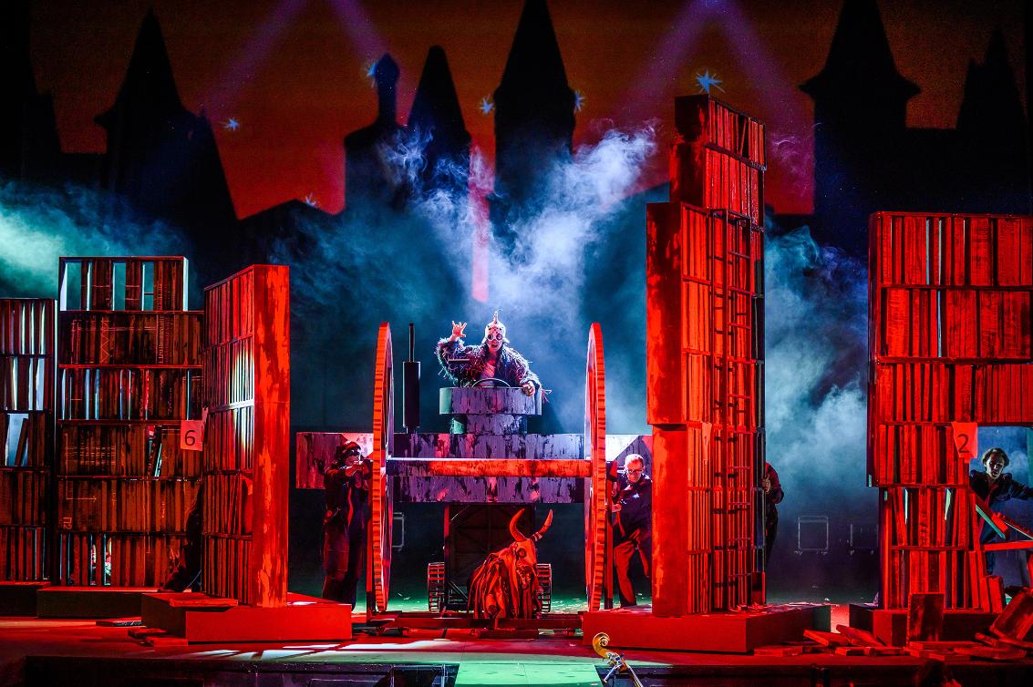 Ход постановки, сценические движения и игра актёров отсылают нас к традициям оперы, единственное — здесь не поют. Декорации масштабные и впечатляющие: огромная колесница в стиле стимпанка, супрематическая говорящая голова, деревянный подвижный конь и даже жёлтый кабриолет. Задник сцены затянут экраном, на котором отображаются фантастические пейзажи, иногда напоминающие кадры из мультфильма “Король Лев”, или же погодные условия фильма “Матрица”. Визуальная составляющая спектакля очень часто обращается к современным образам, от диснеевских мультфильмов и марвеловских комиксов до “Безумного Макса” и гоголевского «Вия». В постановке сложно найти каноническое изображение богатырей и Черномора. Костюмы актёров — интересная находка Елены Жуковой, они очень схематично напоминают русские народные костюмы, пожалуй, это просто намёки на них. Оставлены красный цвет, венки, крой косоворотки, сапоги. Шлемы богатырей представляют нечто среднее между будёновкой и шлемом. Шапка Черномора — фантазийный мотоциклетный шлем. Это всё очень интересно рассматривать и, безусловно, костюмы поддерживают общую эстетику постановки, являются одним из основных её элементов.