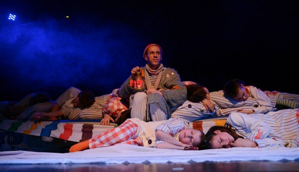 Итак, на сцене — непослушная детвора и суровый (только на первый взгляд!) “сторож снов” — дедушка в стареньком халате с заплатами.