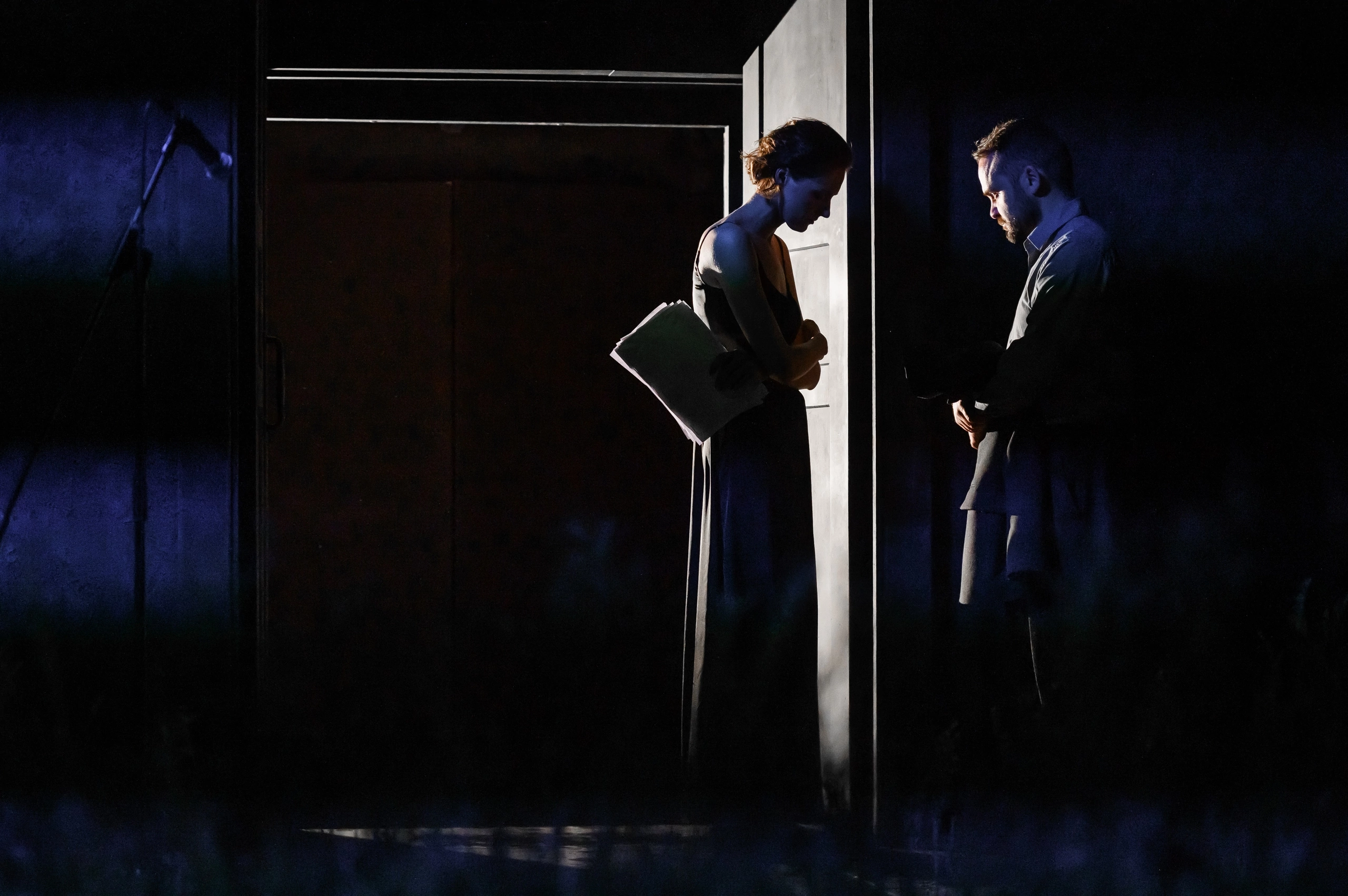 В спектакле оставлены все герои пьесы, и актёрский ансамбль получился вполне удачным. Треплев (Иван Ефремов) видится нервным и чувствительным молодым человеком, без сумасшедших истерик. В первом акте он единственный не поёт, будто выпадает из этого “караоке” со своими новыми формами и восторженной любовью. Одна из сильнейших сцен та, где Треплев и Аркадина разговаривают про любовь к Нине, диалог ведётся очень тихо, в зал долетают только отдельные болезненные фразы. Зритель слышит шёпот, видит глаза героев и их объятие. Большего и не надо. Аркадина (Ольга Белинская) представлена в образе красивой, тонко чувствующей и страдающей от всех этих неприятных скандалов женщиной, без позёрства и излишнего актёрства. Аркадина — нерв и пульс всей постановки. Нина Заречная (Анастасия Пантелеева) юная, немного бунтующая, трогательно красивая, умная и чувствующая девушка. Она в прекрасном белом платье читает пьесу Треплева с текста на экране, как будто это делает впервые, в этом нет ни фальши, ни ненужного пафоса. В этот момент Нина напоминает абитуриентку на вступительных испытаниях. Во втором акте, после жизненных испытаний, она станет тише, серьёзнее, но останется всё такой же трепетной и доброй внутри. Печали оденут её уже в чёрное платье, она будет плакать, но без надрыва. Слёзы будут катиться по ее щекам, больно и страшно, но она только крепче обнимет Треплева.
