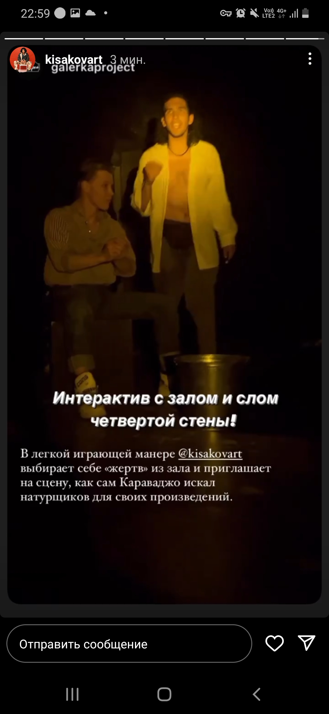 Караваджо прожил 38 лет и умер неизвестно от чего, умер в дороге, спасаясь от тех, кто хочет его убить, а таких было много. В его короткой жизни встречалась большая любовь, а ещё кровь лилась, его и чужая. Спектакль получился яростный и откровенный, Артём приглашал зрителей позировать и гадать ему по руке, обливал их и себя водой, стирал границы между нами, рисовал чёрной краской картину на стене, шутил с нами и был очень серьёзен. Короткая жизнь промелькнула между нами, мы послушали злую и брутальную мальчишескую историю. Плохие парни имеют особенное обаяние, но хочется сталкиваться с ними в театре, а не в жизни. С премьерой, дорогие.