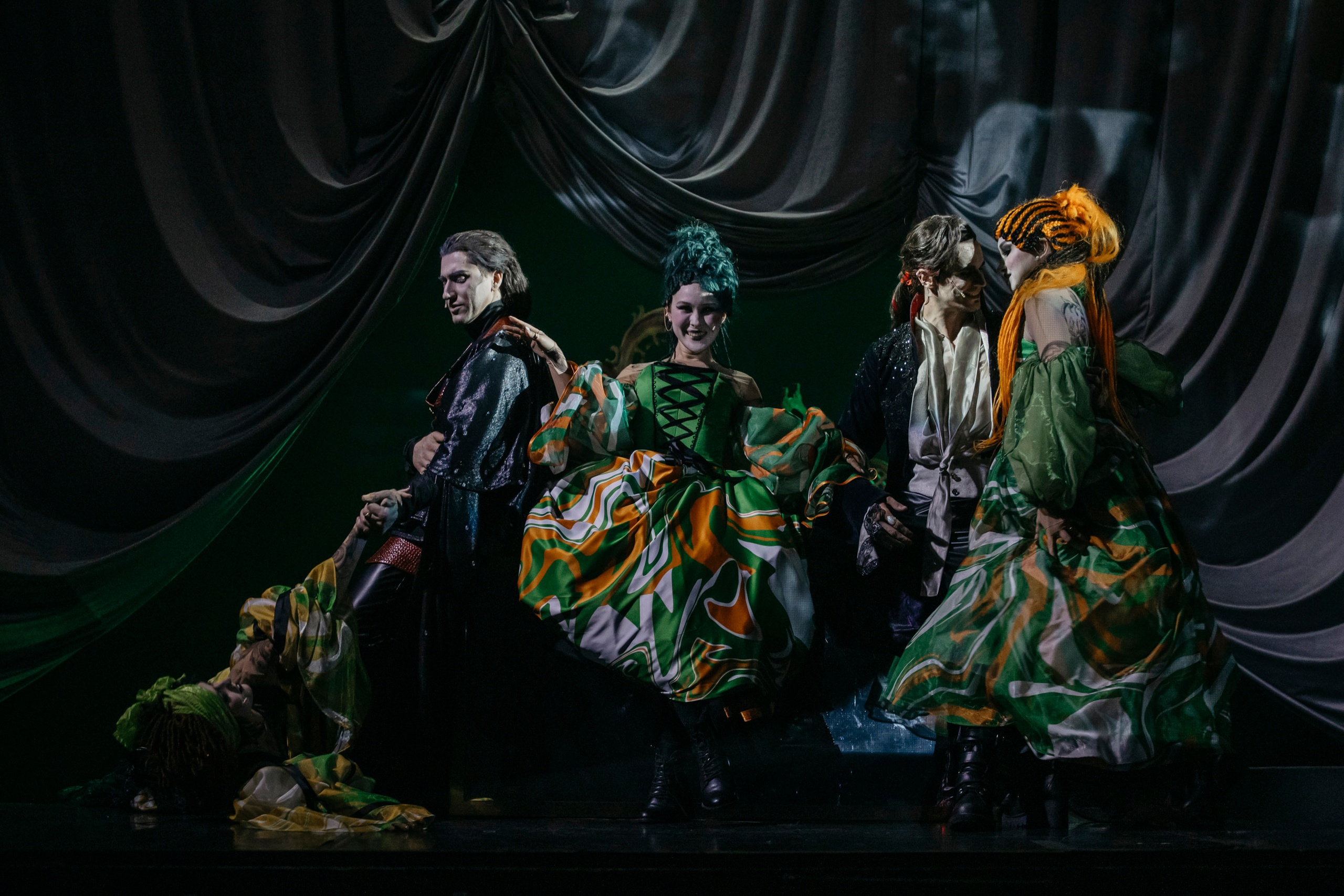 Разбавляют холодность и трагичность происходящего неунывающие и жизнерадостные гости карнавала – они балагурят и веселятся, оставляя на потом все тревоги и горести. Их костюмы – яркие и цепляющие взгляд на фоне царящего на сцене полумрака (художник по костюмам – Алена Пескова).
