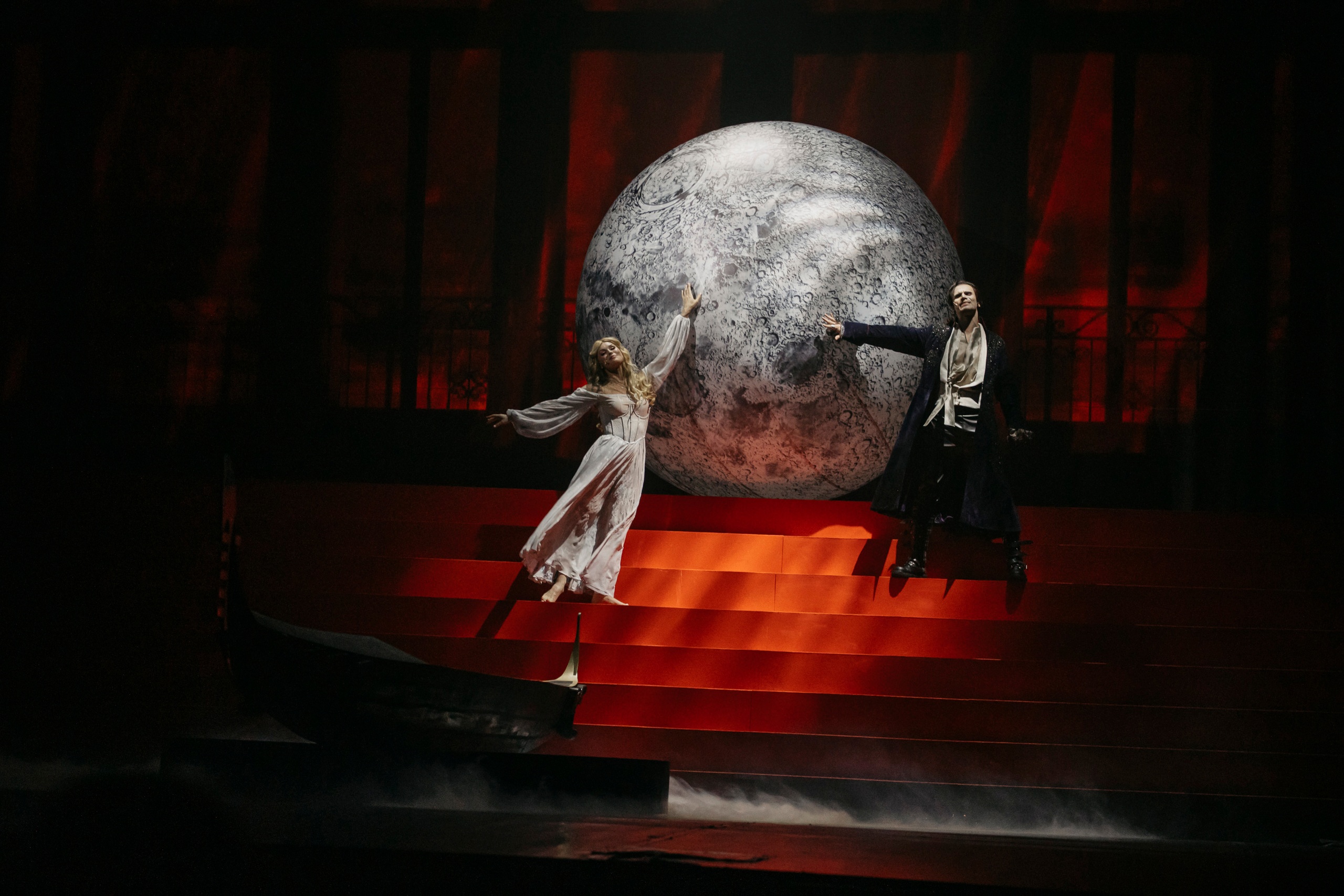 Поскольку в центре истории – любовная драма молодых людей, львиная доля времени в спектакле отведена этой линии. Перед зрителем мелькают сменяющие друг друга сцены у гондолы, на карнавале, в гостинице, во дворце. Центральным же элементом, связывающим и локации, и самих героев, является Луна. Цветаева, а вслед за ней и создатели постановки, не случайно выбрала символом развернувшейся трагедии именно это небесное светило, ведь оно отвечает за переменчивый и неверный образ и представляет изменчивое женское начало. И действительно, на протяжении всего действия мы наблюдаем, как Генриетта мечется, выбирая между чувством и разумом, думая больше о себе и своем положении, нежели об ищущих ее благосклонности мужчинах. О множественности женского пола в виде дуэта размышляют и главные мужские персонажи – Казанова и Капитан (Ростислав Колпаков): «Они капризные, они желанные!».