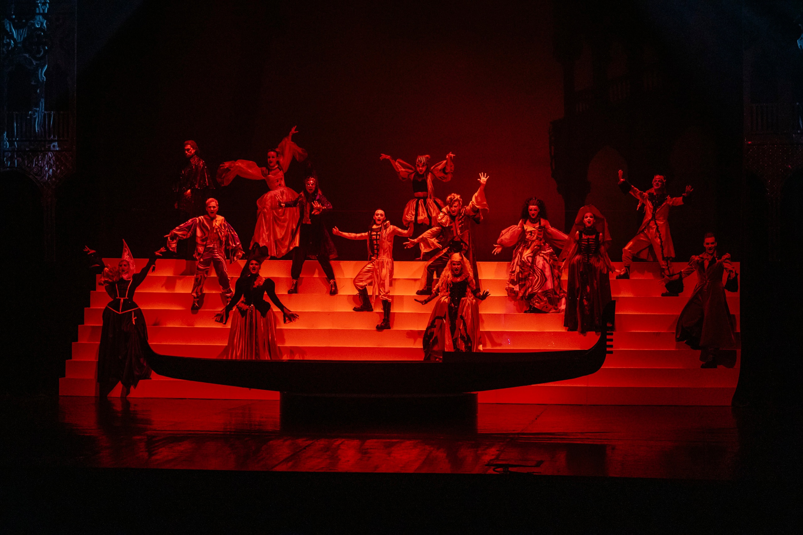 Несмотря на то, что приключения наших героев протекают на Венецианском карнавале, нужно быть готовыми к тому, что буйства красок вы не увидите. Световое оформление мюзикла – минимальное (художник по свету – Татьяна Яцюк). Вероятно, концепция спектакля – мрачные, приглушенные тона, создающие гнетущую атмосферу некой предопределенности и безысходности.
