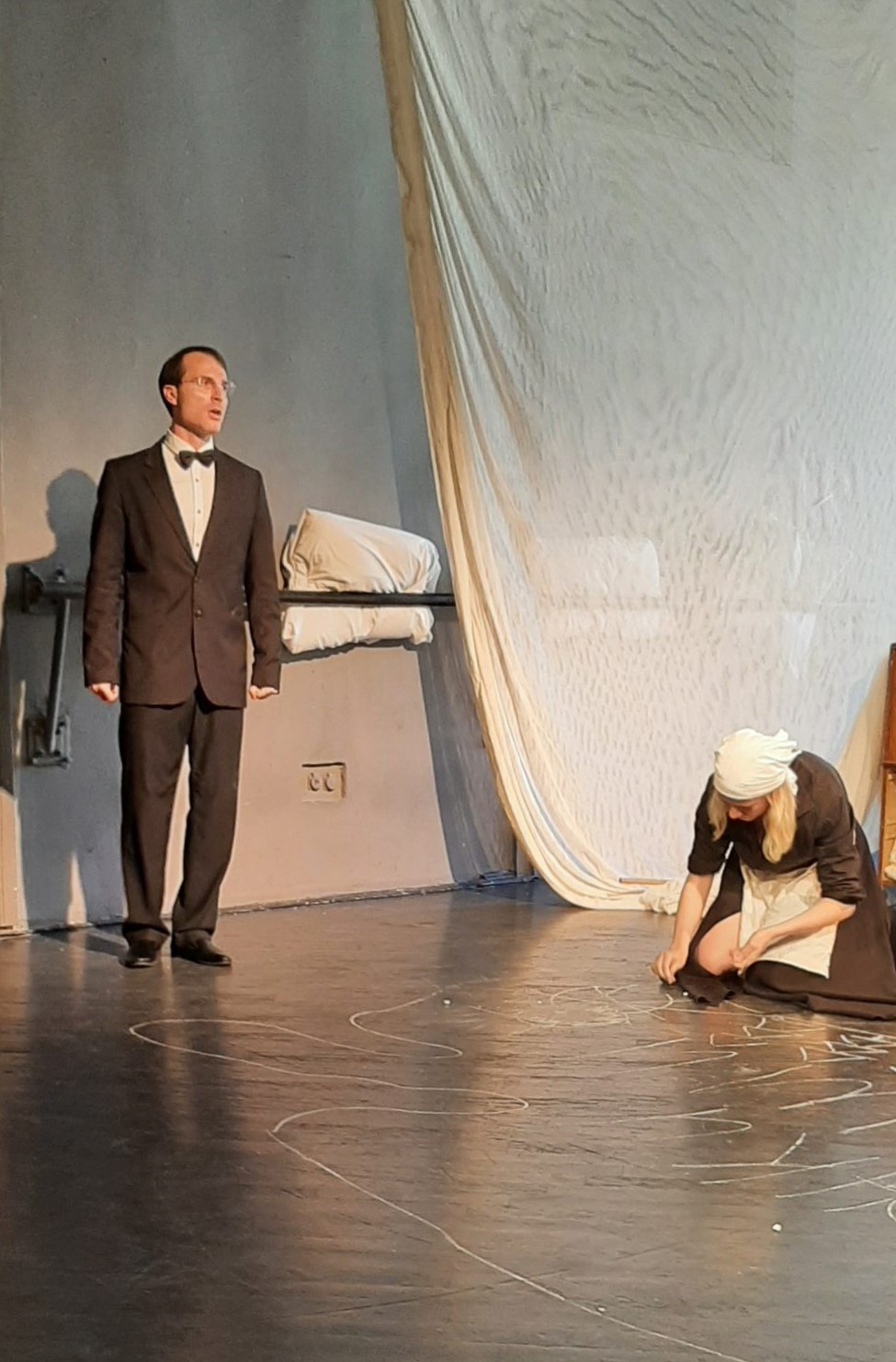 Этот спектакль родился в формате эксперимента, которую мы затеяли с Фильштинским. Я ставила спектакль по технике Демидова, а он по этюдному методу Станиславского. До самого конца мы не видели ни репетиций, ни этюдных проб противоположной команды.