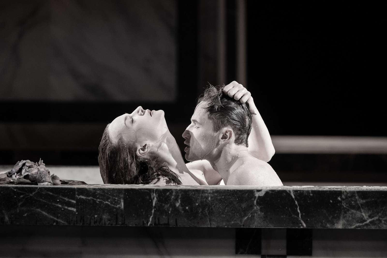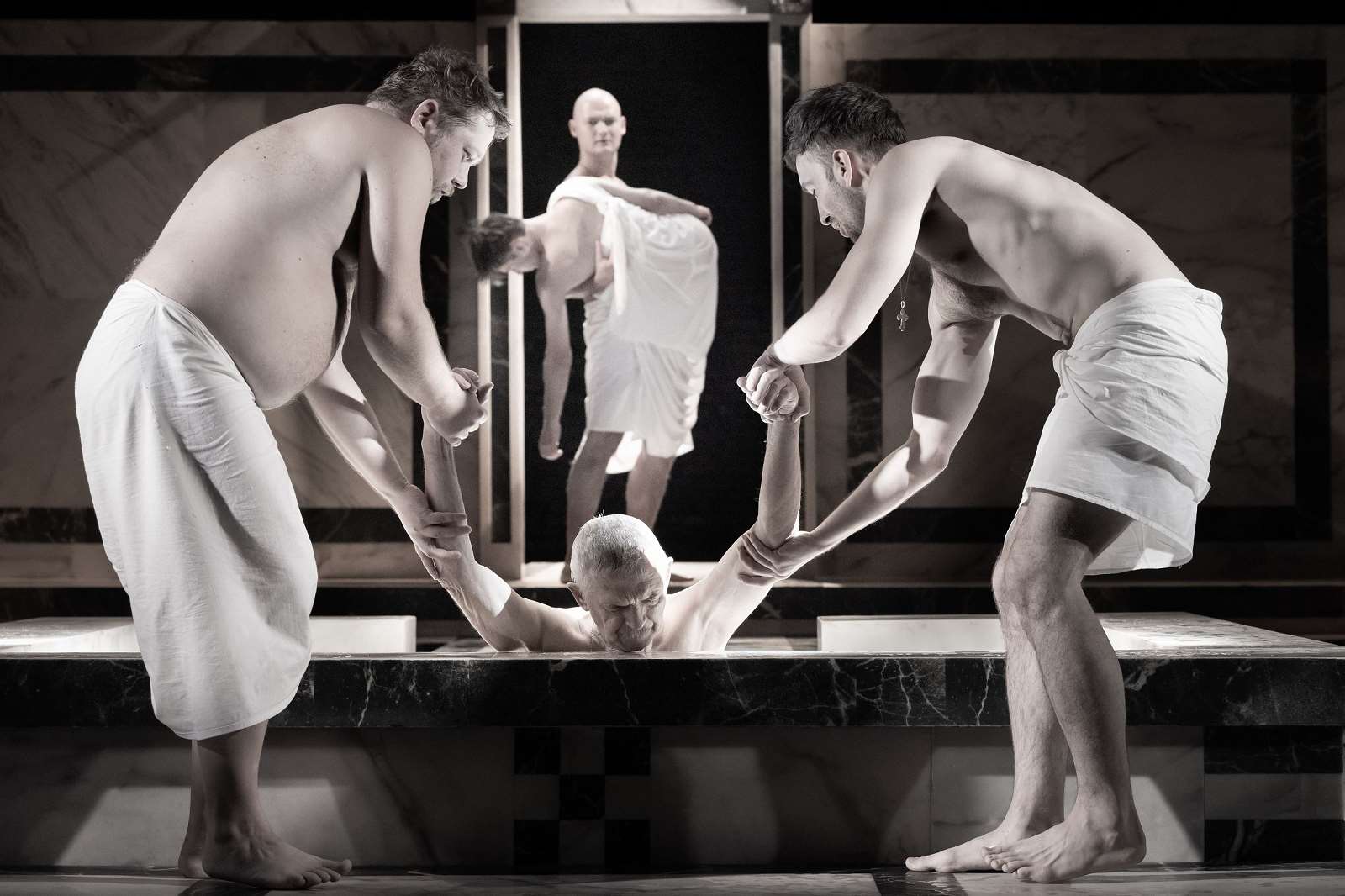 Актёры на протяжении всего действия будут ходить в простынях, накинутых на манер тоги, или набедренных повязках, удивительно — сколькими способами из простыни можно сделать одежду. Такое количество обнажения сначала обескураживает, потом наступает привыкание и открывается истинное намерение хода режиссёра. Неприкрытые, оголенные полностью или частично, они предстают перед нами полностью откровенными в своих замыслах и деяниях. Часто актёры принимают позы, схожие по пластике с античными статуями или библейскими сюжетами. Декорации бани не меняются на протяжении всего спектакля, такой концепт декларируют идею, что до сих пор решения принимаются в банях, на охоте, в опере или на прогулке на яхте. К концу, конечно, такой ход немного утомляет, хочется перемены визуала. Всё банное действо происходит под музыку Генделя, Верди и Бизе. Создаётся новый шик — мрамор, оперная музыка, модельные девы, кресты и деньги в конвертах.