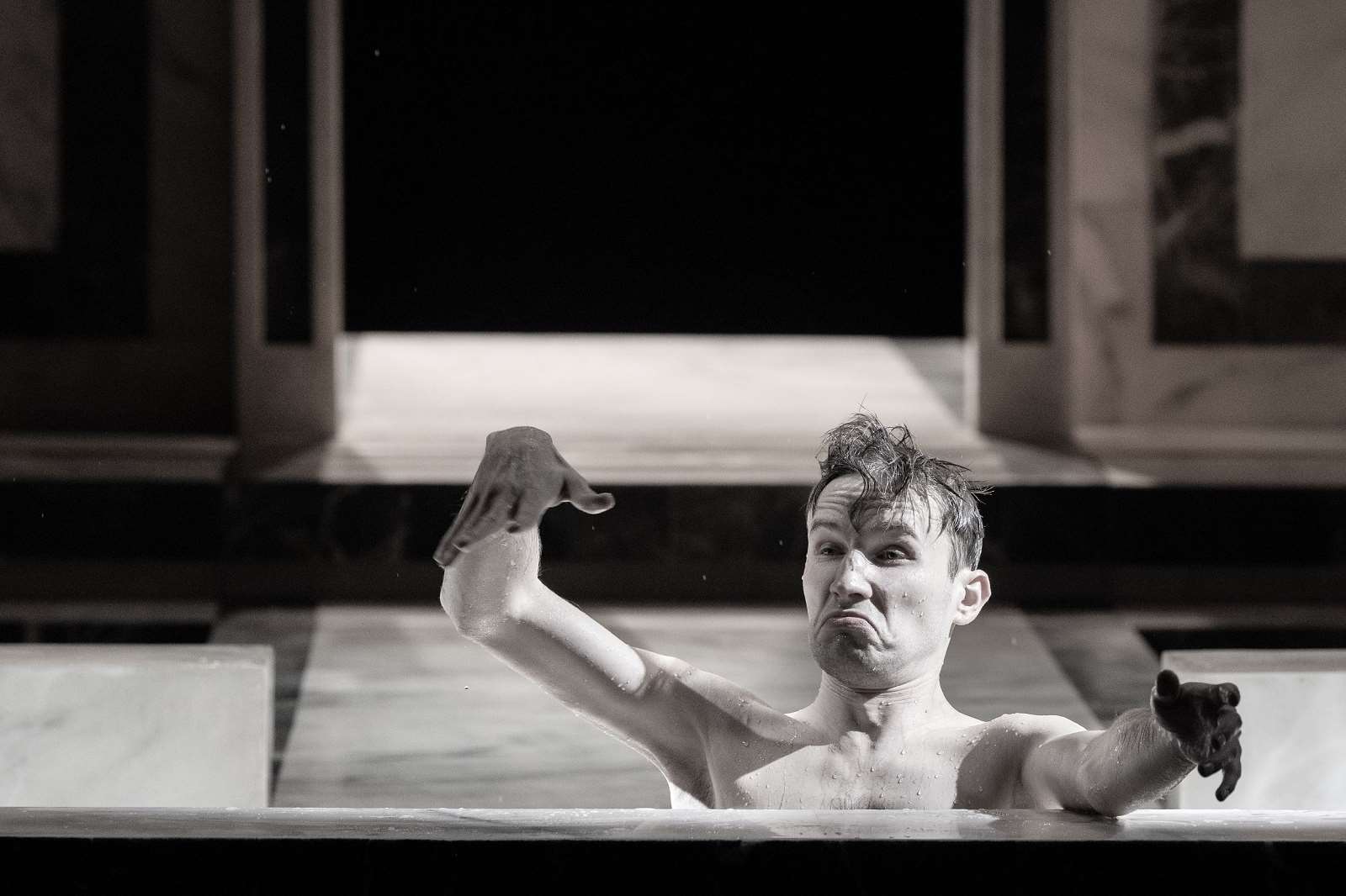 В момент, когда наступает прозрение и правда вскрывается, немного пошатываясь, Городничий падает в бассейн, увлекая за собой скатерть со всеми кушаньями. Мгновение, ещё, и он появляется над водой, а вокруг плавают яблоки, виноград, опрокинутые кувшины. Но Городничий встаёт и медленно выходит из бассейна, накинув на плечи отяжелевшую от воды скатерть. Идёт твёрдо шаг за шагом, волоча свой груз, свет высвечивает его колоссальную фигуру, будто высеченную из мрамора. И тут бы финал, но нет. Спектакль закольцовывается изначальной сценой. Приехал новый ревизор и вот опять стайка чиновников мечется в бассейне.