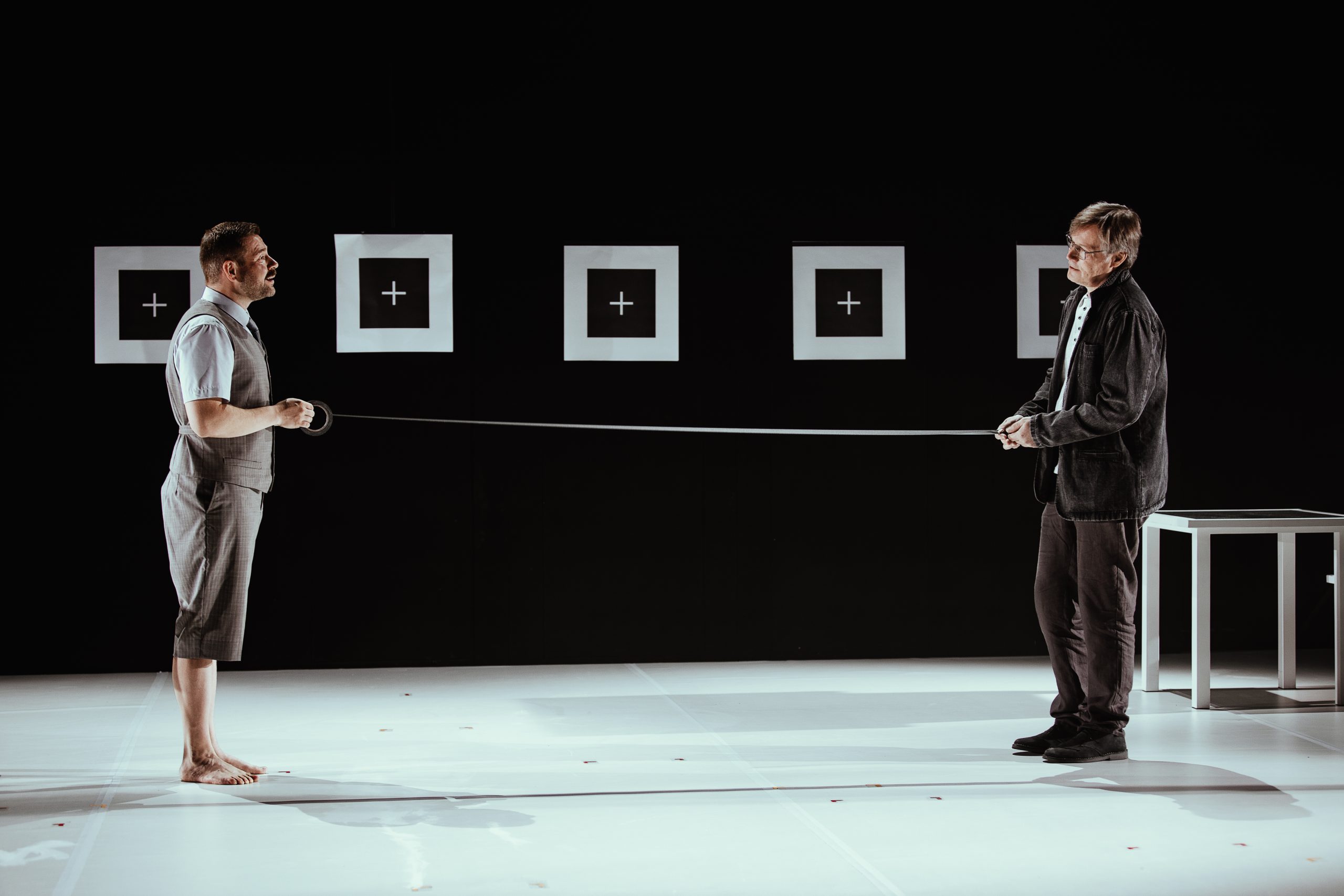 На сцене — лаконичное монохромное пространство с табличками на подставках, именуемыми деревьями, а на деле это словно могильные плиты с крестами (художник-постановщик Николай Симонов), герои — в безликих графитовых костюмах (художник по костюмам Мария Данилова). Возводит действие до античной трагедии пение а капелла хора (ансамбль N’CAGED) по текстам белорусского драматурга Константина Стешика, основанных на произведения глашатаев абсурда — ОБЭРИУтов.