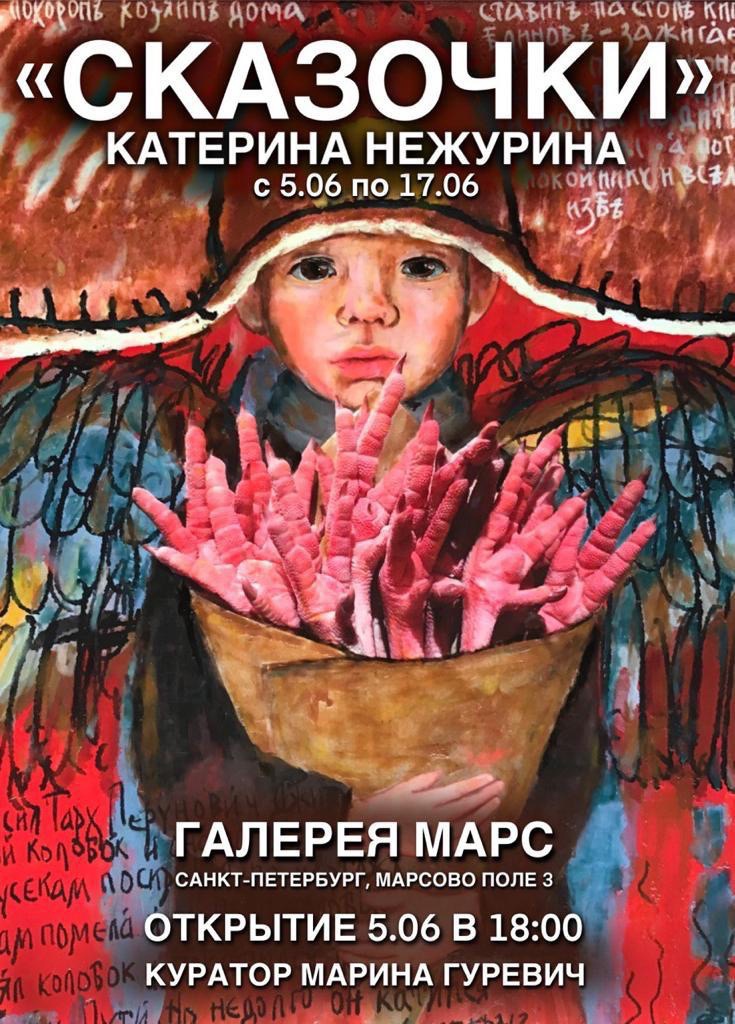 Открытие нового выставочного проекта «Сказочки» состоится в Арт-пространстве «mArs» 5 июня в 18.00. На выставке будут представлены картины уральской художницы Кати Нежуриной. Толчком для начала рисования, по словам самой художницы, стала книга У. Моэма «Луна и грош». После нескольких экспериментов с выбором материала рисования Катя остановилась на пластилине. Этот необычный выбор помогает ей создать свой, особенный мир изображений, позволяющий по-новому увидеть темы, некоторые из которых могут, по её словам, быть неудобными для зрителя, вызвать вопросы, неожиданные мысли, креативный диалог с самим собой.