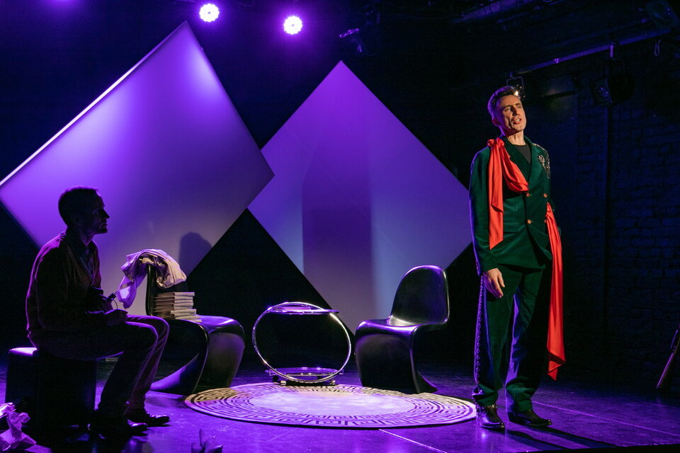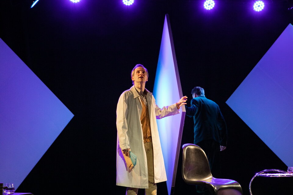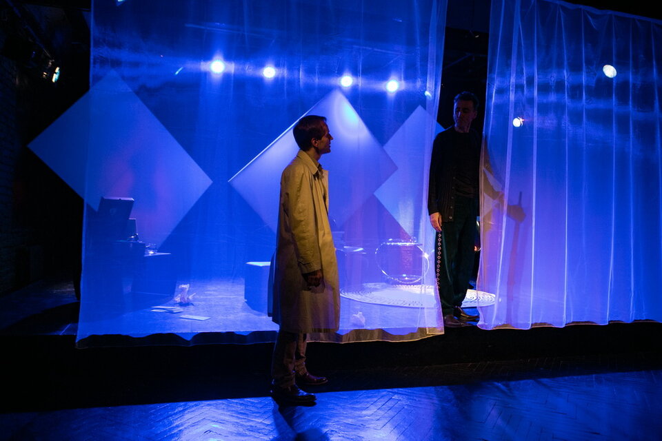 Режиссер Людмила Никитина назвала спектакль “Невысказанная любовь”, но в остальном выбрала классическое прочтение. Два актера. В роли писателя-затворника Абеля Знорко – Кирилл Ульянов, в роли его гостя-журналиста Эрика Ларсена – Валентин Воробьев. Минималистичные декорации: два кресла и журнальный стол, табурет с проигрывателем пластинок, штора, которая создает окно между зрительным залом и сценой. Белые полотна на заднике художник по свету Мария Колоколова раскрашивает в разные цвета по ходу пьесы. Один раз там появится женский силуэт. Речь пойдет о женщине, которую знают оба.