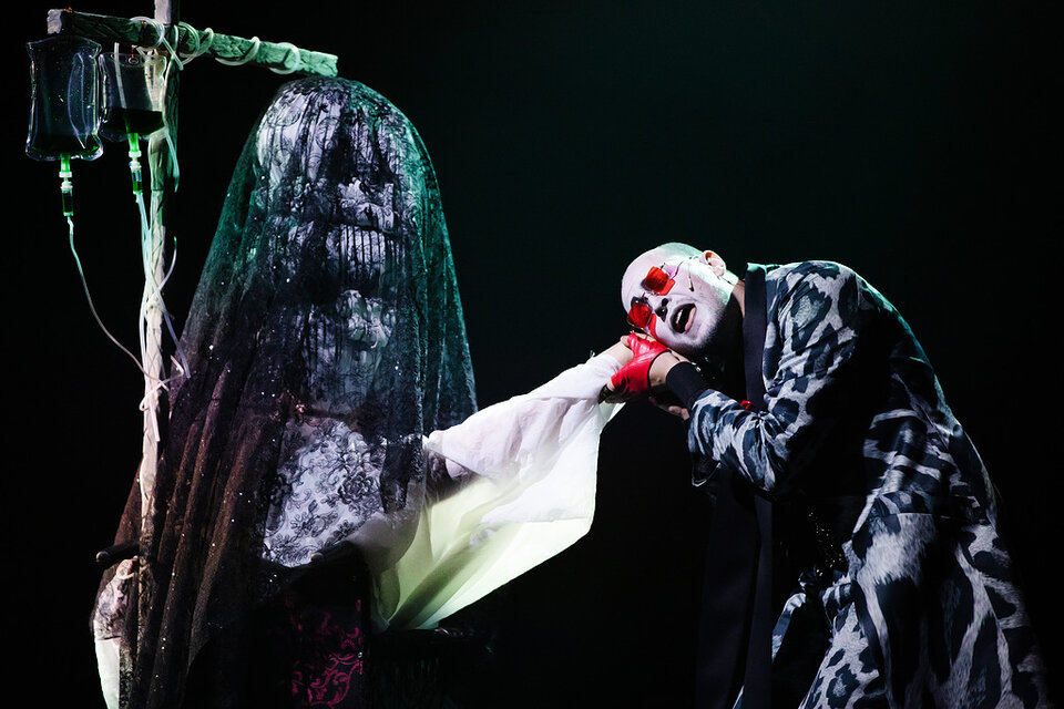 Сценограф Станислав Никитин вместе с художником по свету Татьяной Яцюк создают в сценическом пространстве неожиданный микс из кабаре с его пышностью, мигающими лампочками и странными персонажами – чего только стоит актёр (он же хореограф-постановщик) Никита Борис, исполняющий сразу три роли – Мадам Петуховой, Беспризорника и Безенчука, или карикатурно-мрачная Елена Станиславовна Боур (Татьяна Калашникова) в чёрном бархатном платье и с огромной ниткой жемчуга на всё тело – и из иллюстраций к книжной истории про приключения двух авантюристов. Здесь огромная световая, как из гримёрок, рамка становится то стенами дома, то местом для вычурных танцевальных па, то потолком. По подиуму, уходящему в зал до седьмого ряда, совершают дефиле некоторые персонажи спектакля, по нему из зала идёт впервые на сцену и Бендер (Артём Иванов), и по нему же спускается к зрителям до плотного интерактива (в поисках милостыни) Киса в исполнении самого постановщика спектакля.