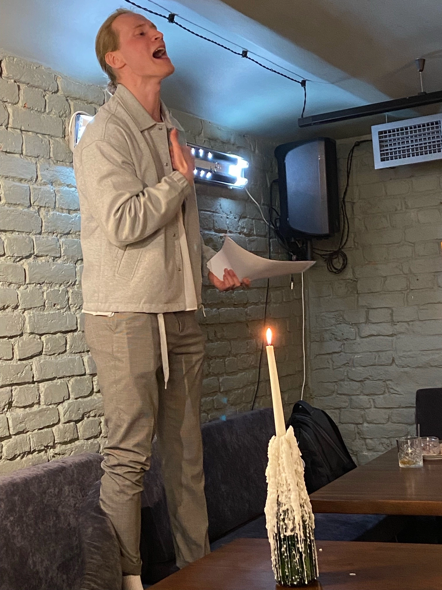 20 июля в кабаре «Шум» мы посмотрели спектакль молодых бызят и Паши Михайлова «Равновесие с небольшой погрешностью». Все комнаты богемного пространства были оккупированы искрометным и щемящим юмором Хармса. У нас был выбор — слушать ли о больной любви (Юра Дементьев, Лера Чеховская), наблюдать за безумным взаимодействием ползующих и кричащих Гоголя и Пушкина (Артём Кисаков, Игорь Астапенко), рисковать быть облитым куриным супом (Влад Низовцев, Паша Михайлов), следовать за мыслью экскурсовода (Алексей Чистяков) или погрузиться в мир птиц и рыб (Вячеслав Пискунов).