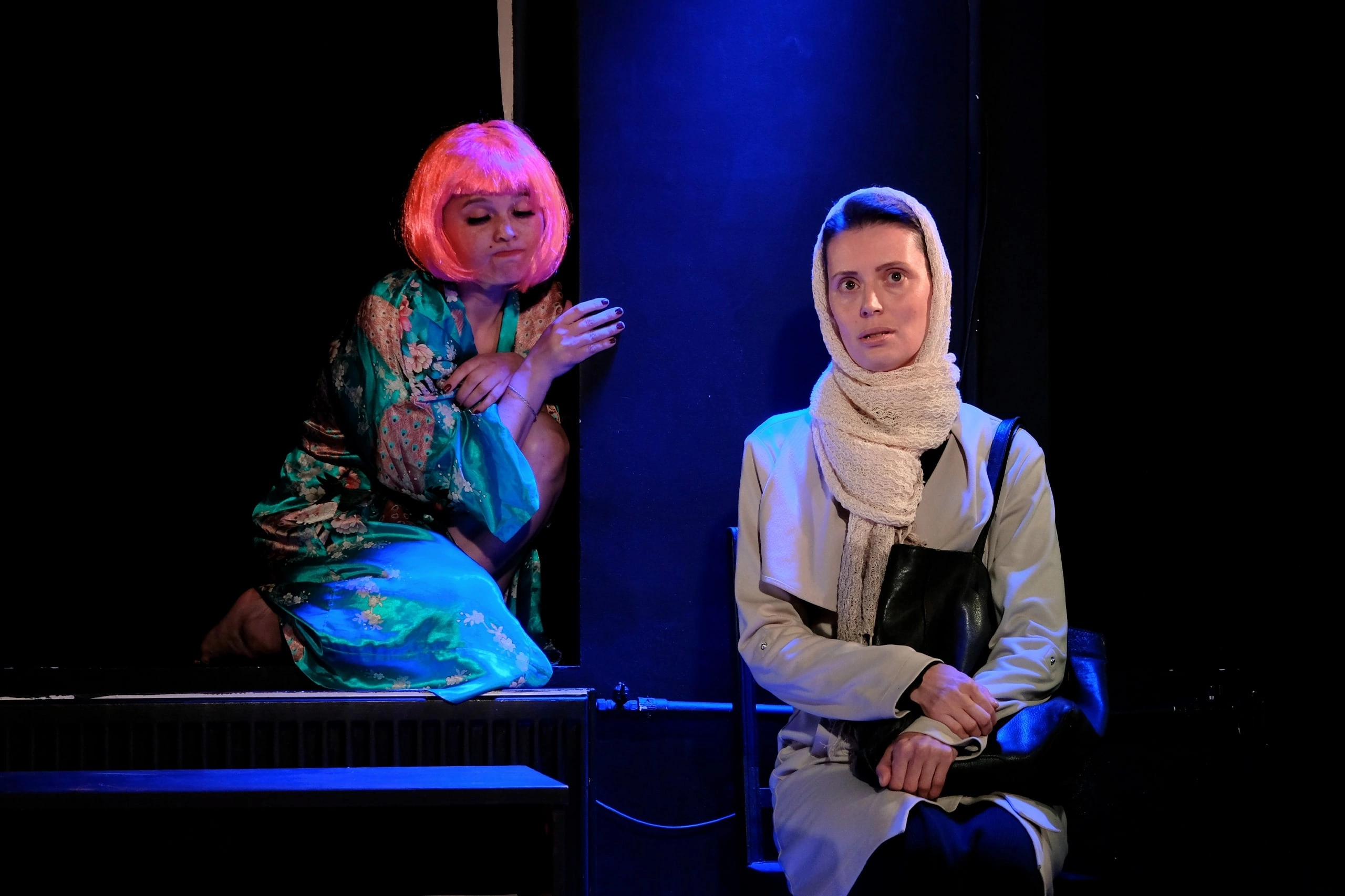Сцена – продолжение зрительного зала, вместо декораций – интерьер типичной хрущевки в маленьком городке. На подоконниках – тарелки, бутылки, нехитрая закуска. И двери со ступеньками.
